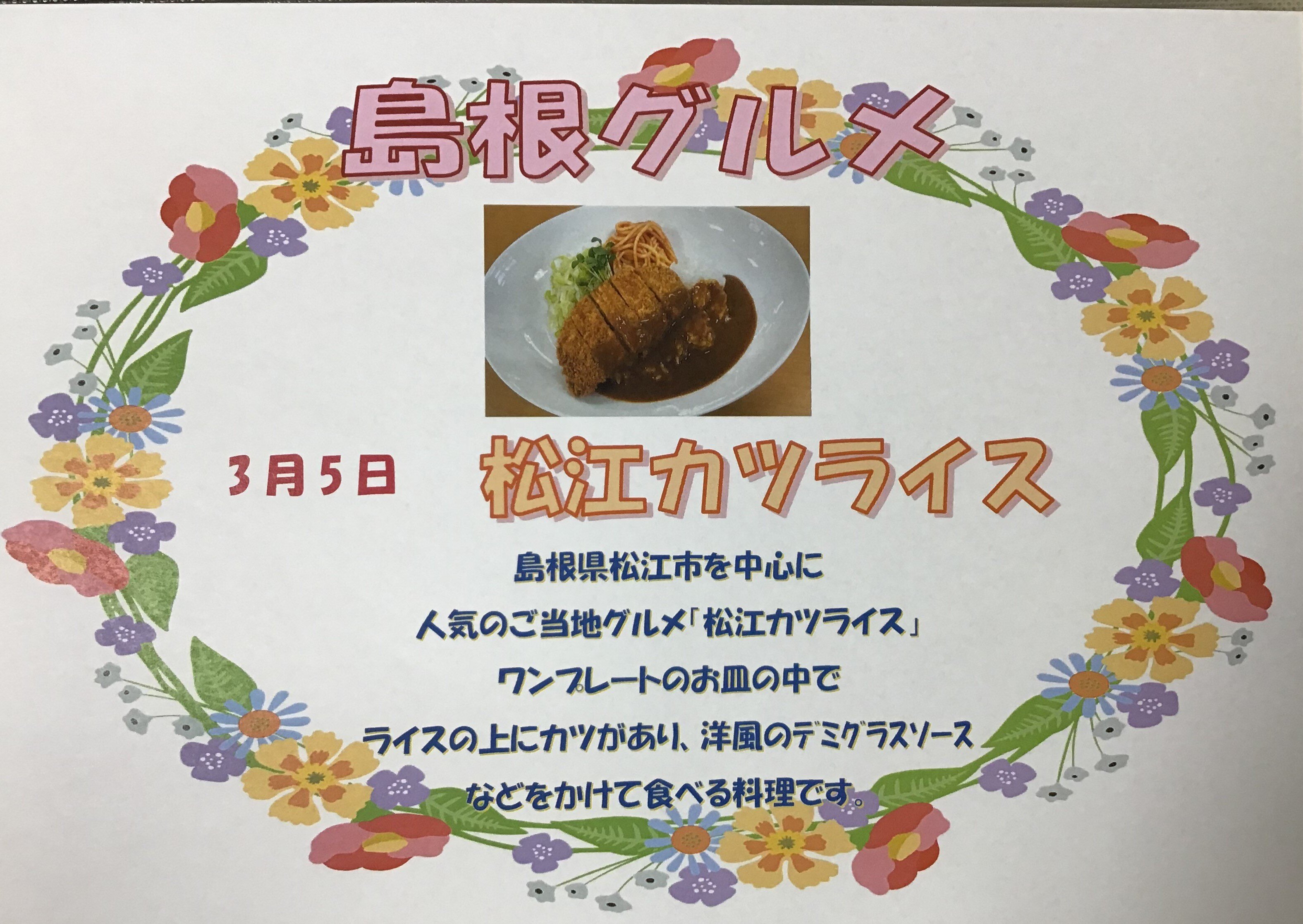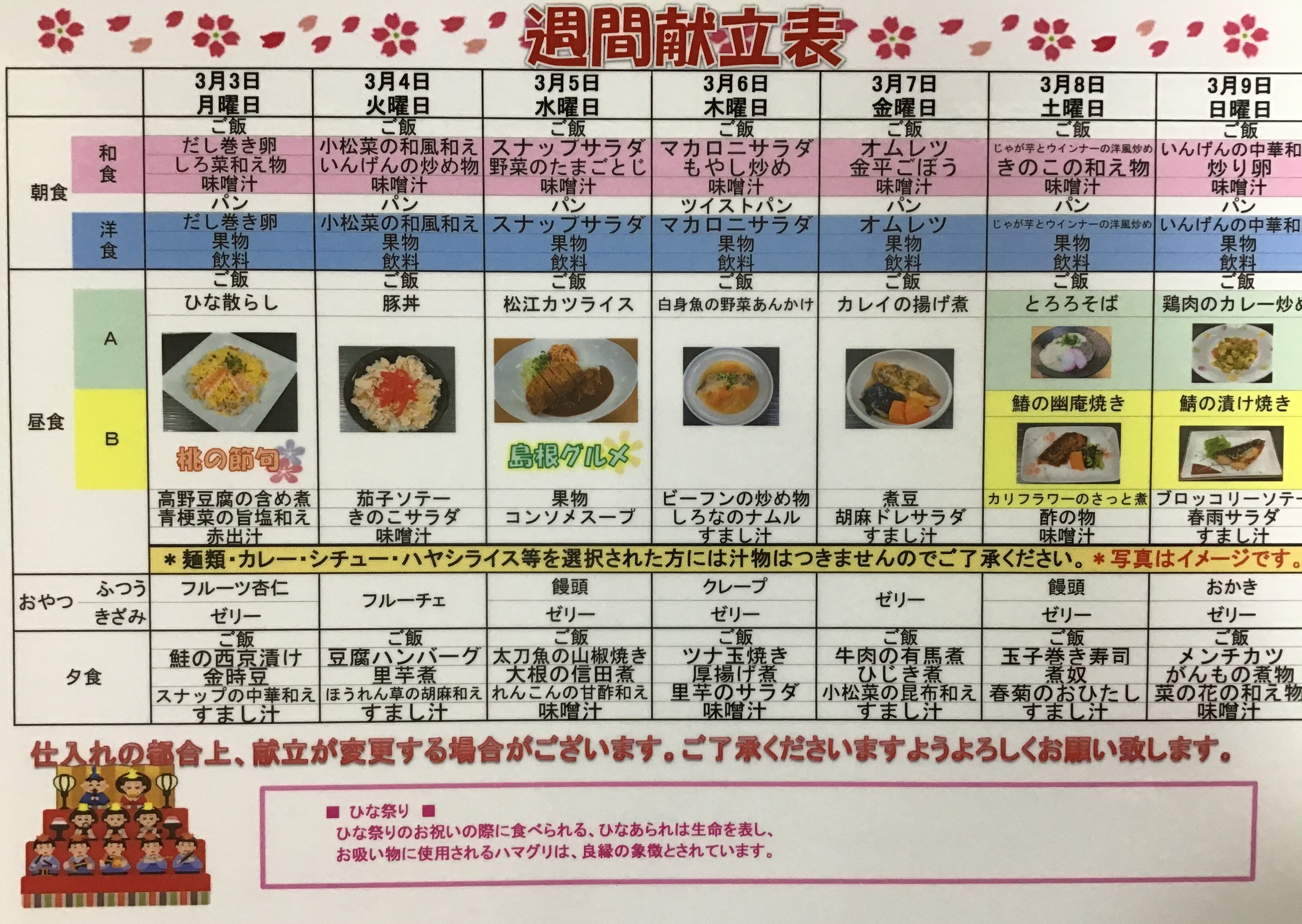今回は「3月3日から3月9日までのメニュー表の紹介」です。