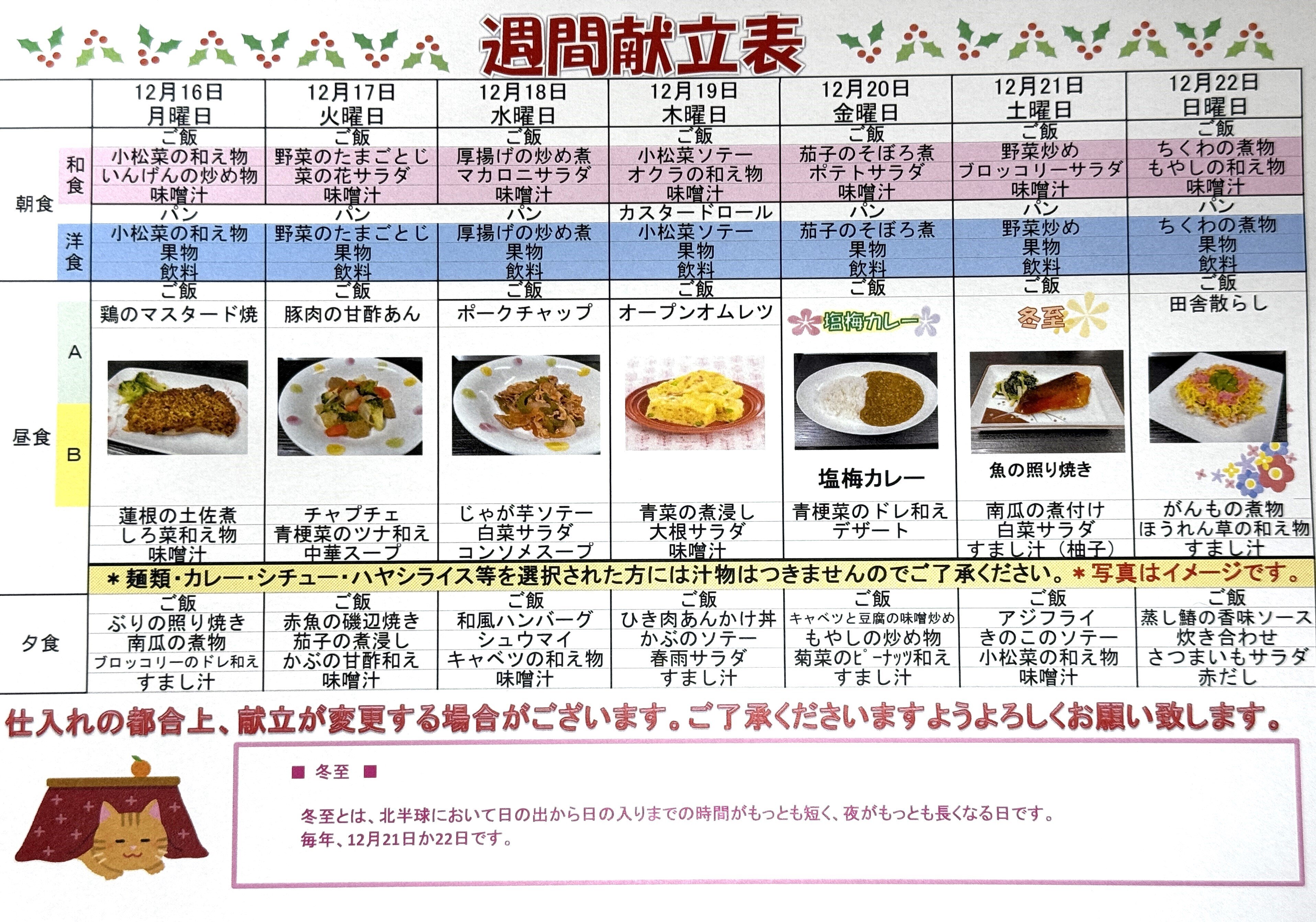 今回は「12月16日から12月22日までのメニュー表の紹介」です。