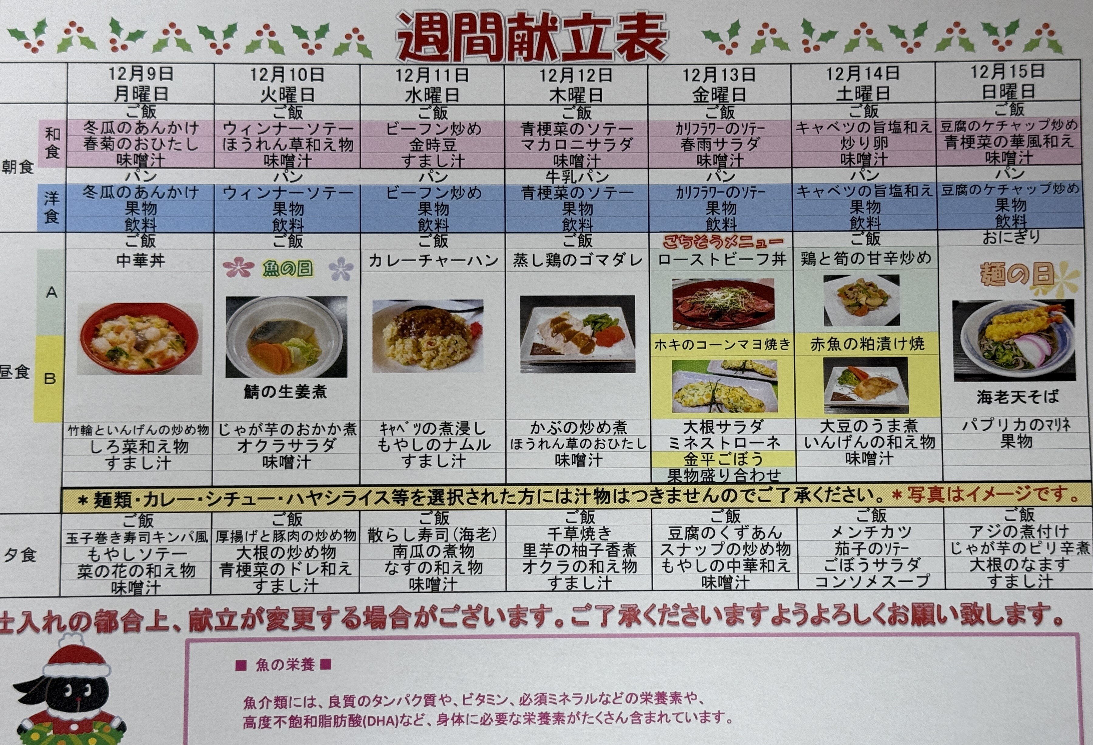 今回は「12月9日から12月15日までのメニュー表の紹介」です。
