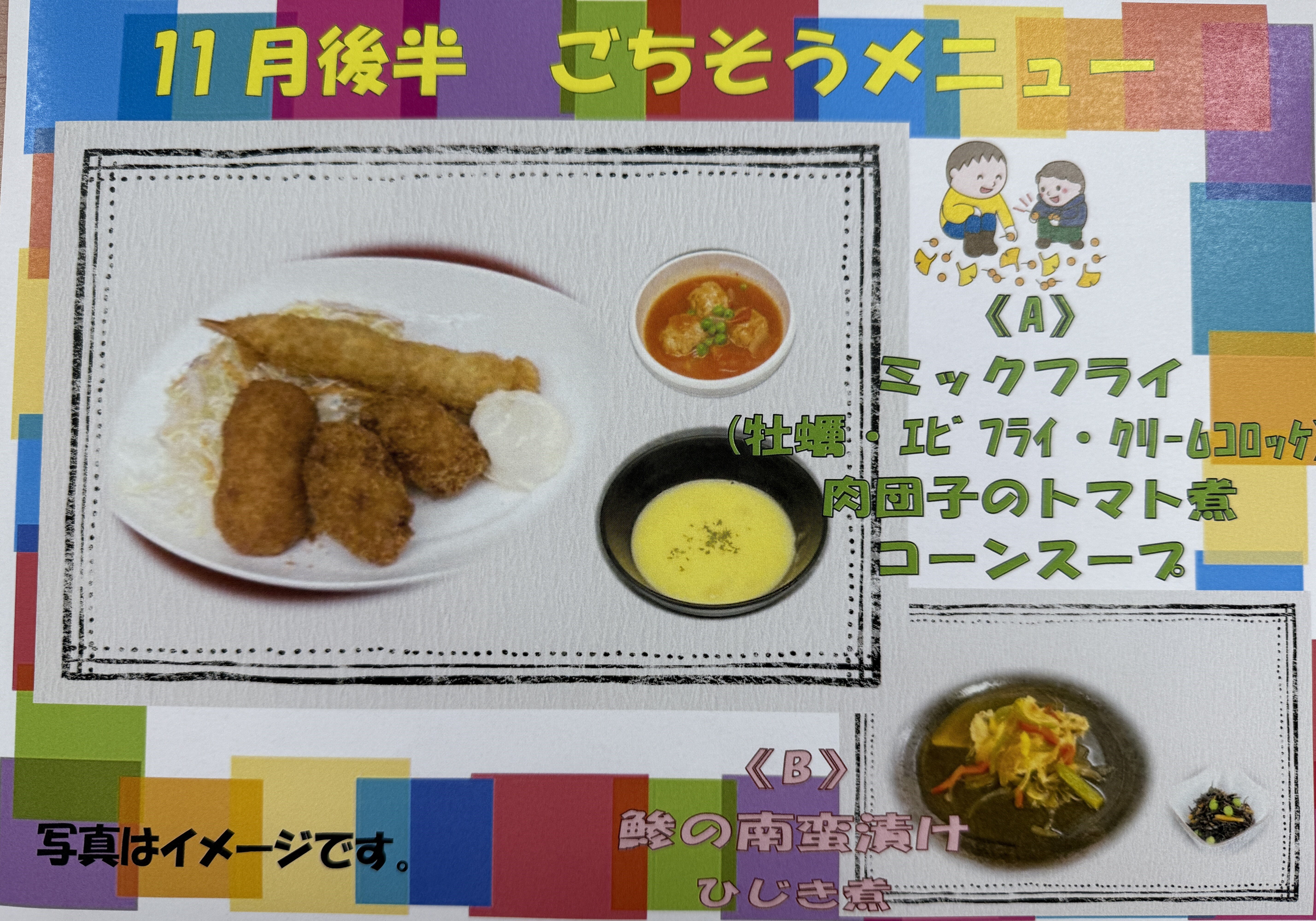 今回は11月22日㈮提供予定の「ごちそうメニュー」のお知らせです。