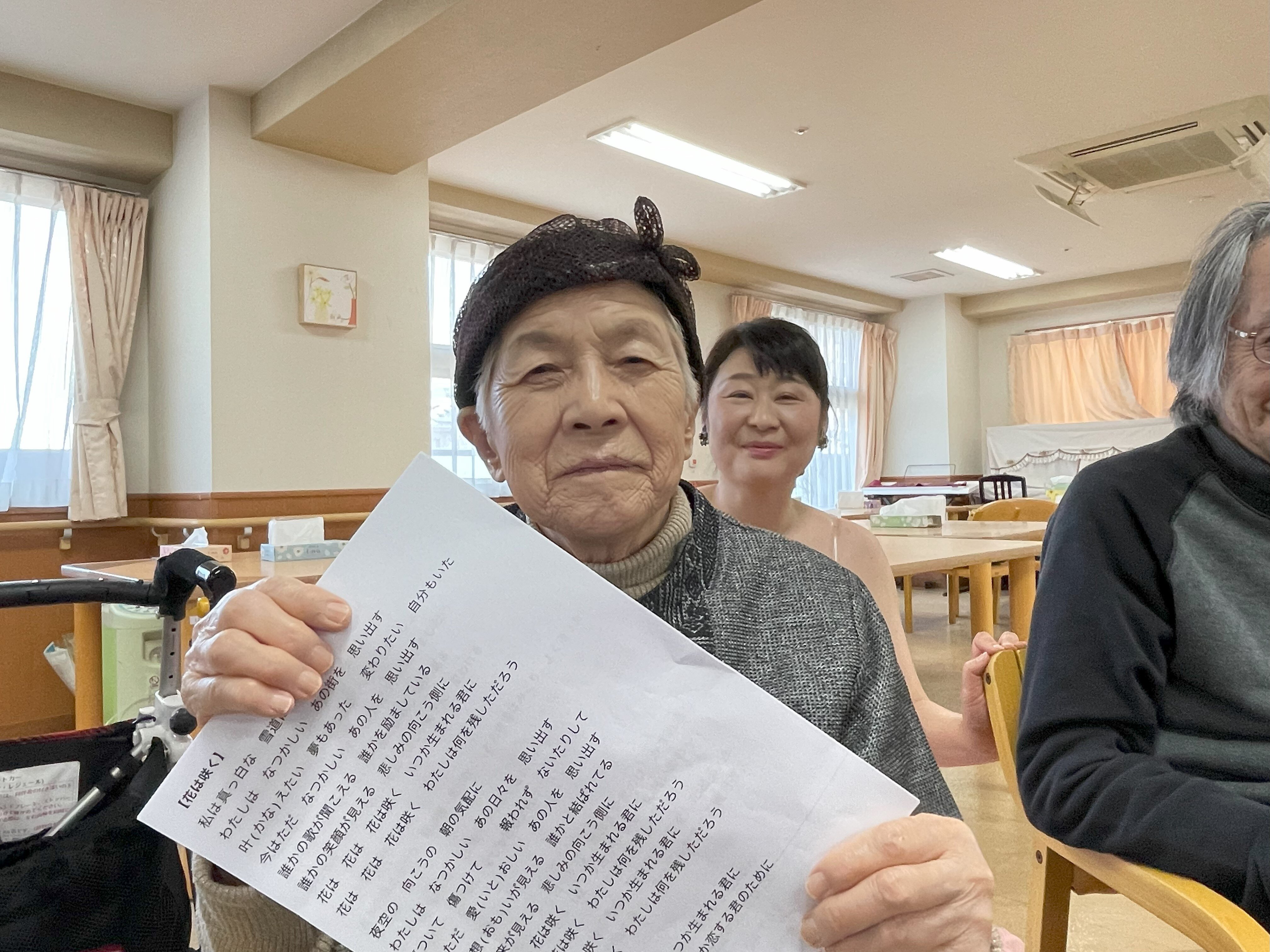 当日の朝、ご入居者が一緒に歌いたいから歌詞がほしいと仰られたので、あわてて用意しました。皆さん、準備万端です!