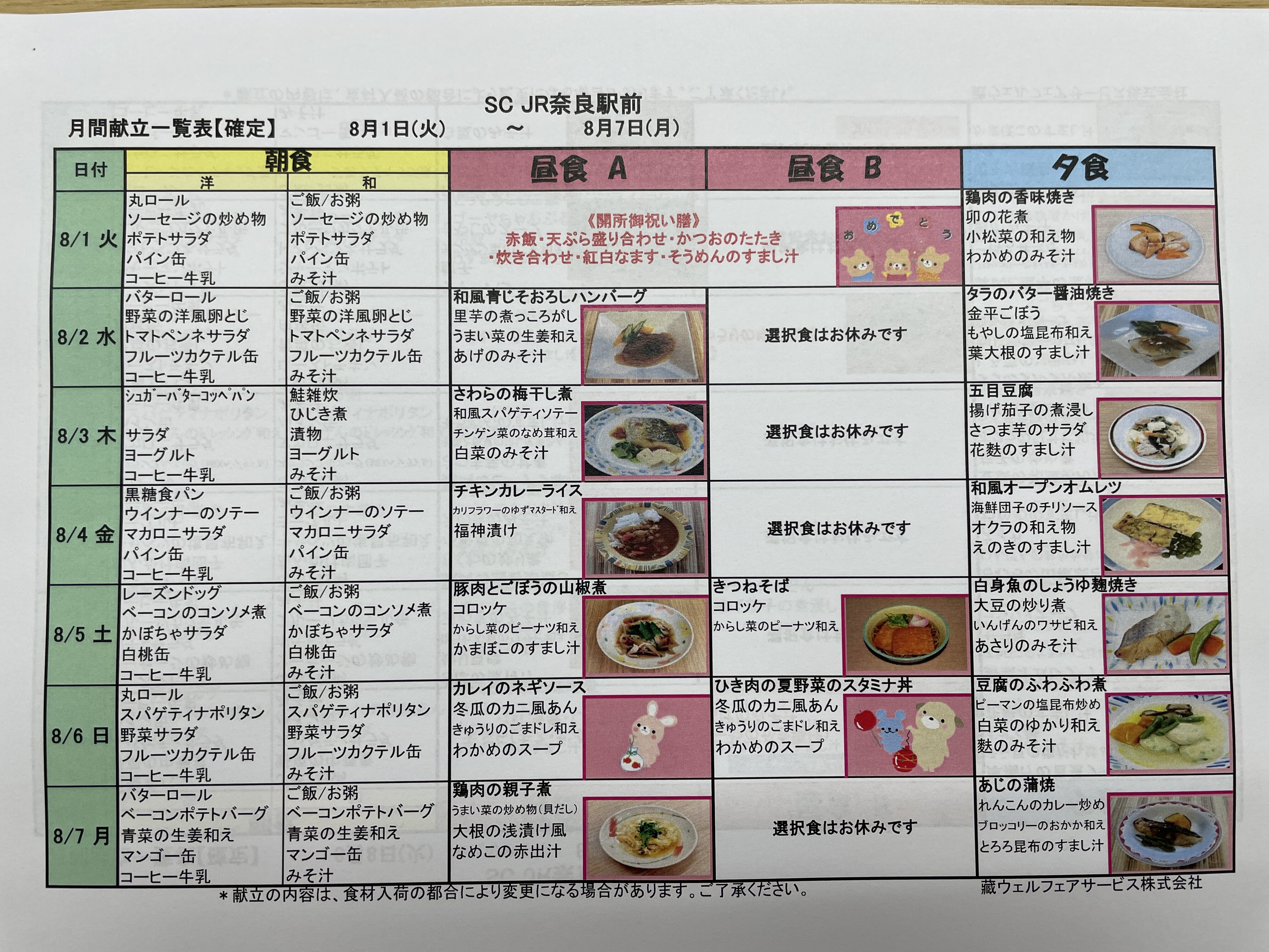 1日の昼食に開所御祝い膳が提供されます。
