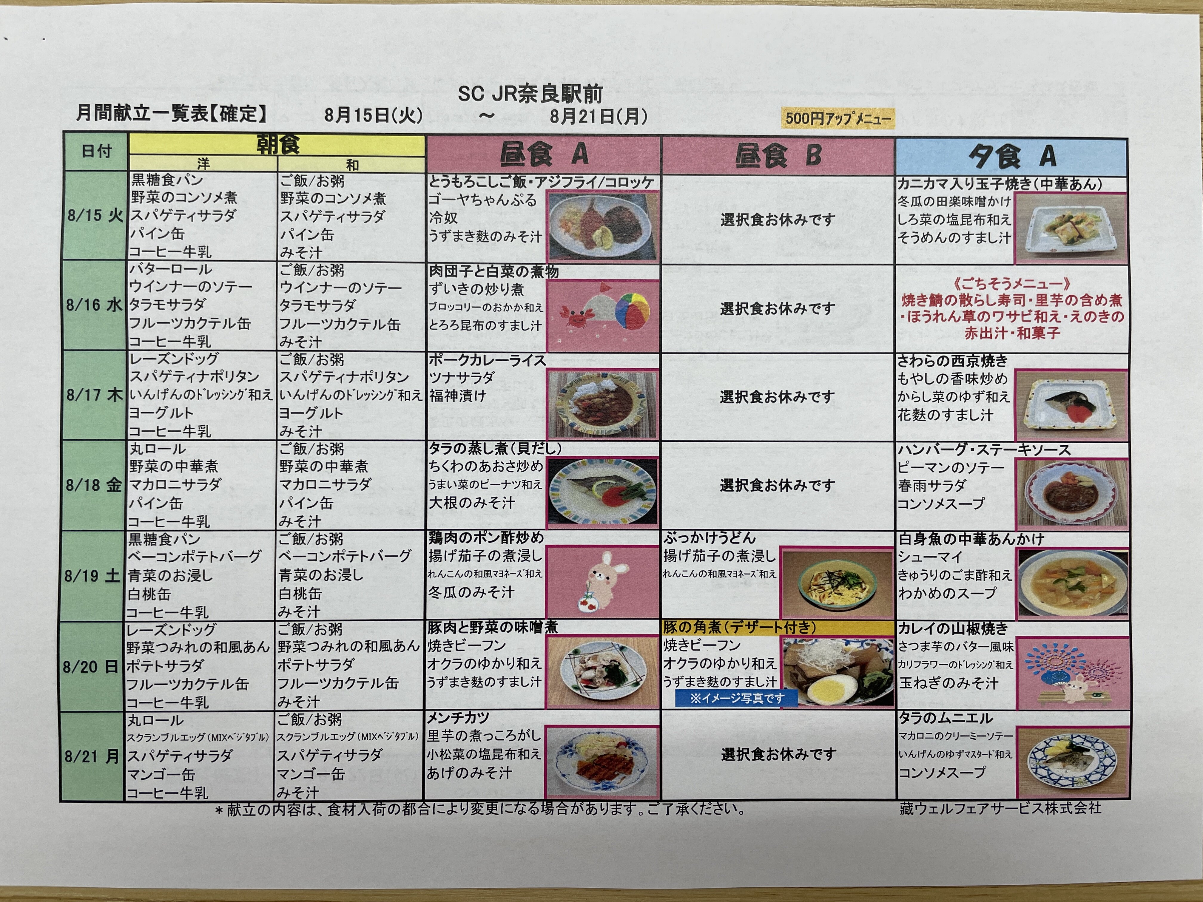 20日の昼食にグレードアップメニューが提供されます。