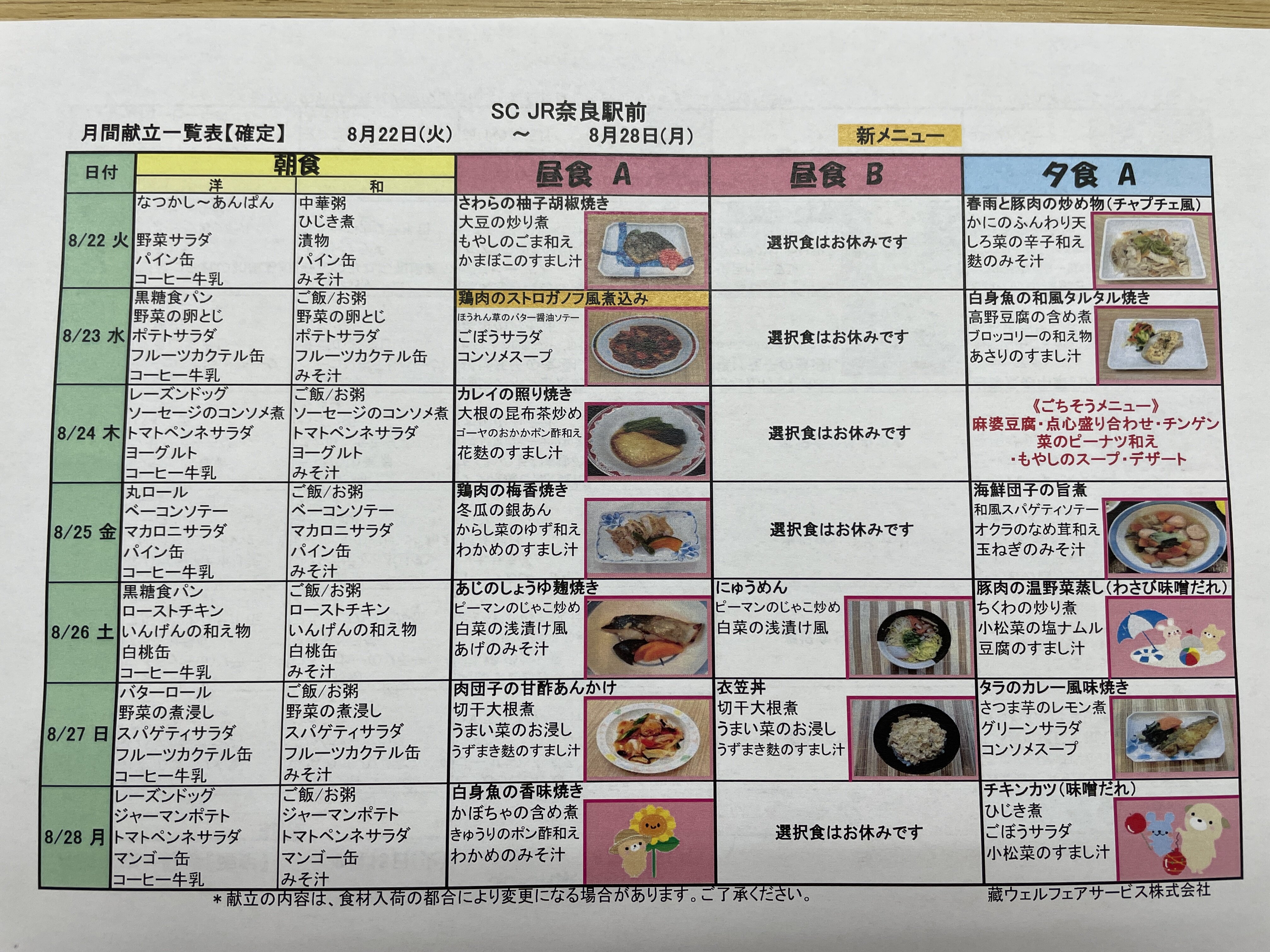 24日の夕食にごちそうメニューが提供されます。