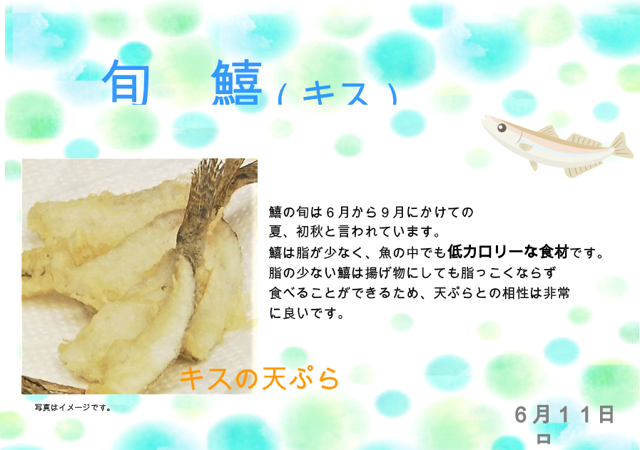 6/11の昼食は旬の『きす』をつかった「きすの天ぷら」が提供さます。