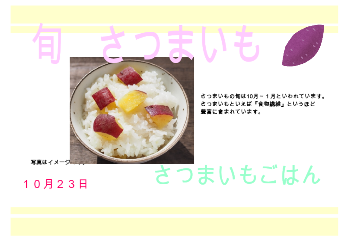 10/23の昼食には旬のさつまいもを使用した『さつまいもごはん』が提供されます。