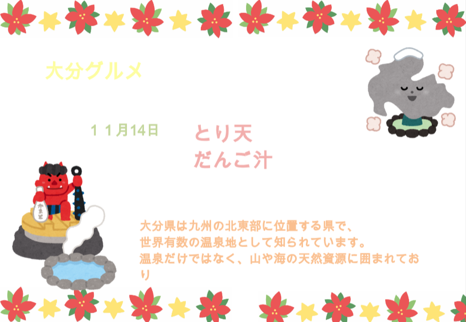 11/14は大分グルメの「とり天」と「だんご汁」が提供されます。