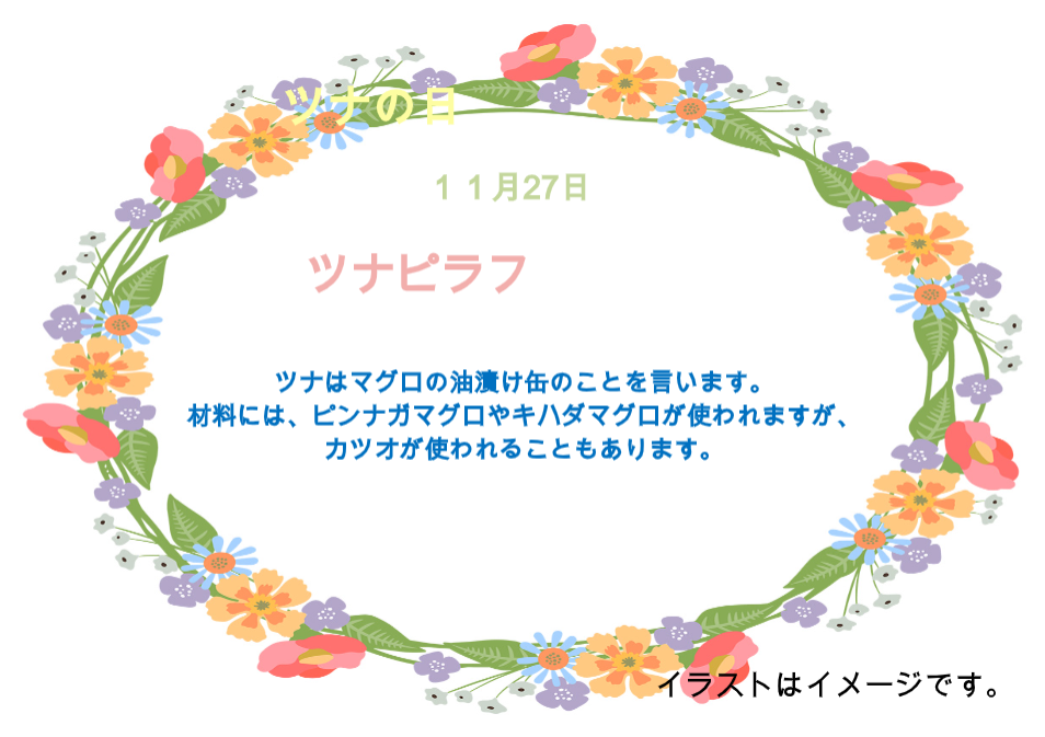 11/27の昼食に「ツナピラフ」が提供されます。