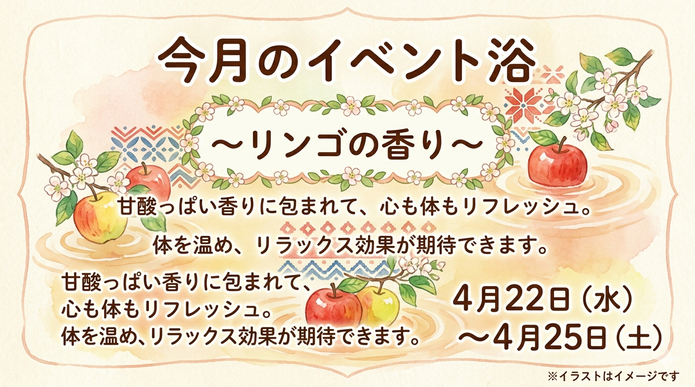 爽やかで甘いりんごの香りに包まれてゆっくりと湯に浸かっていただければ幸いです♪