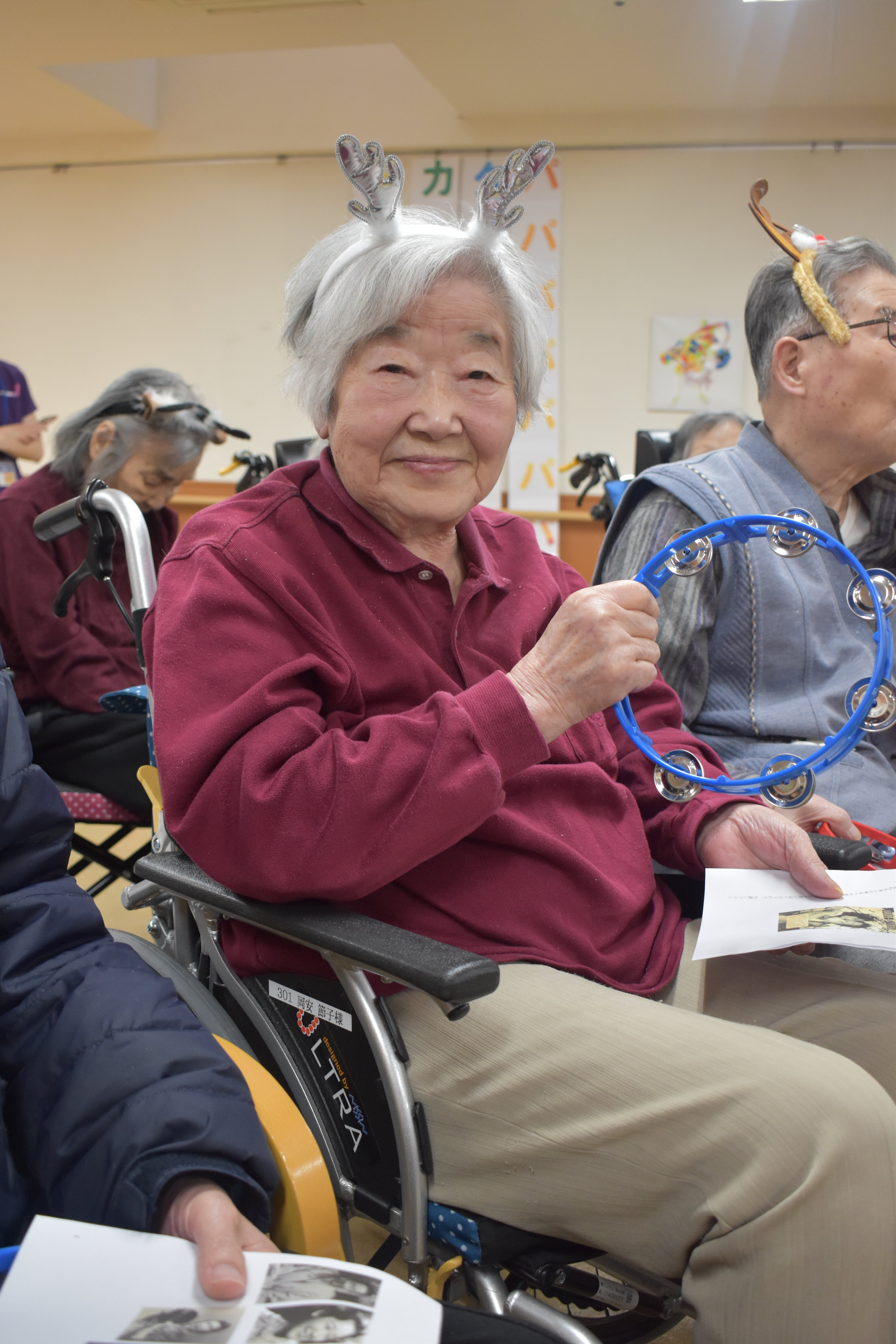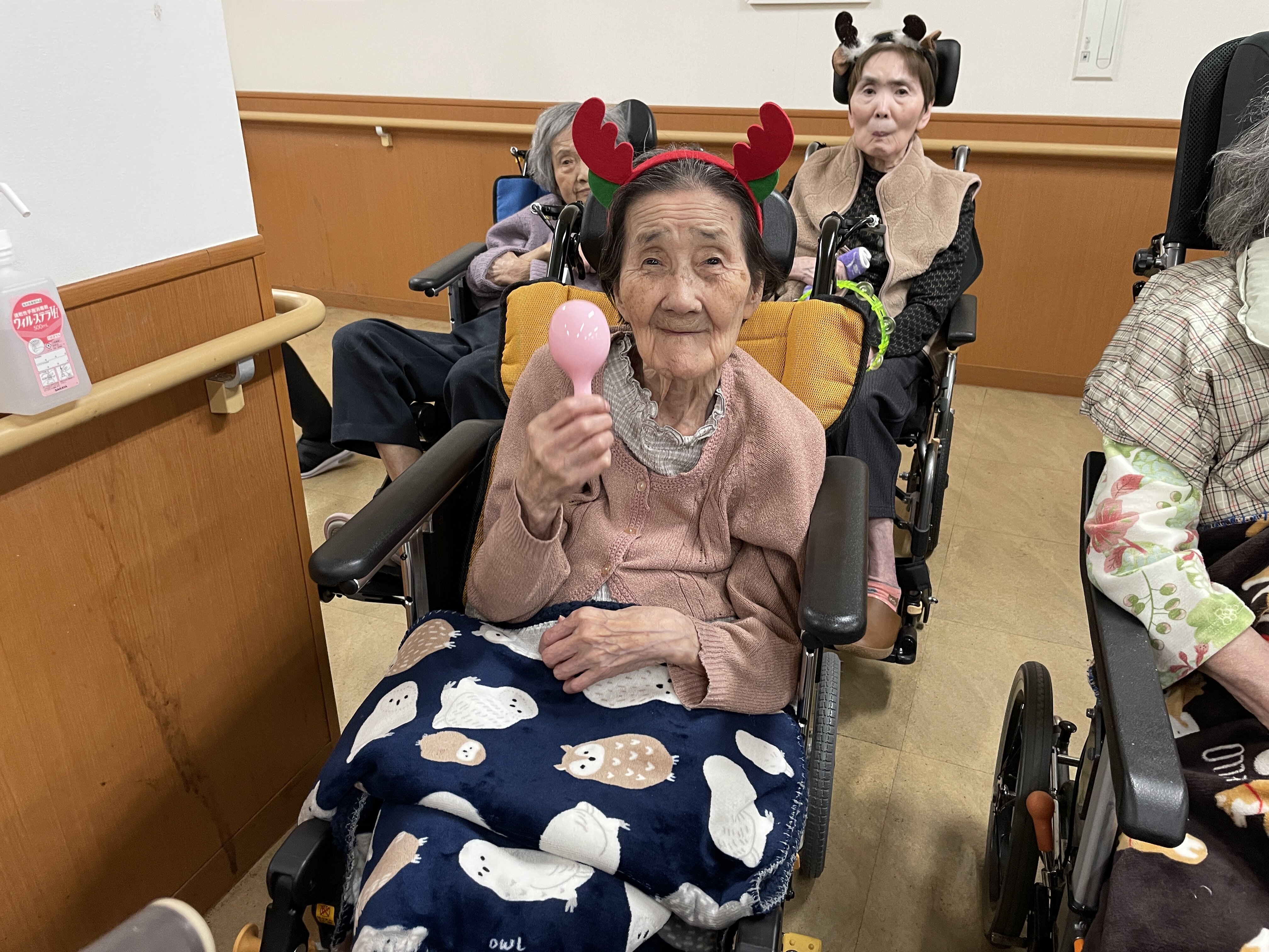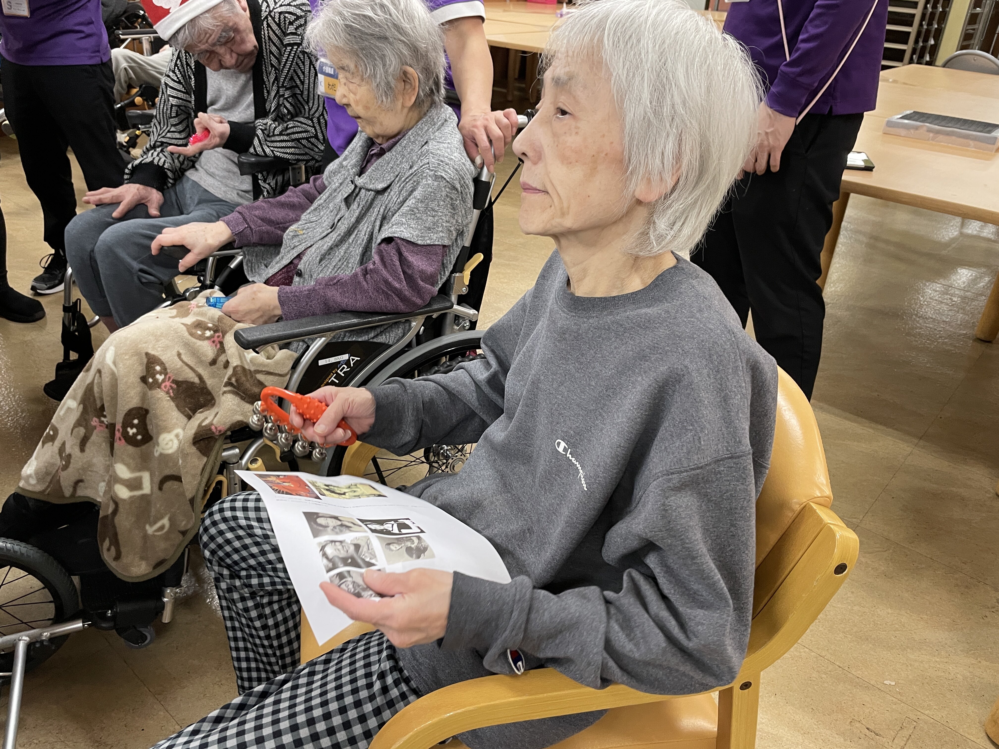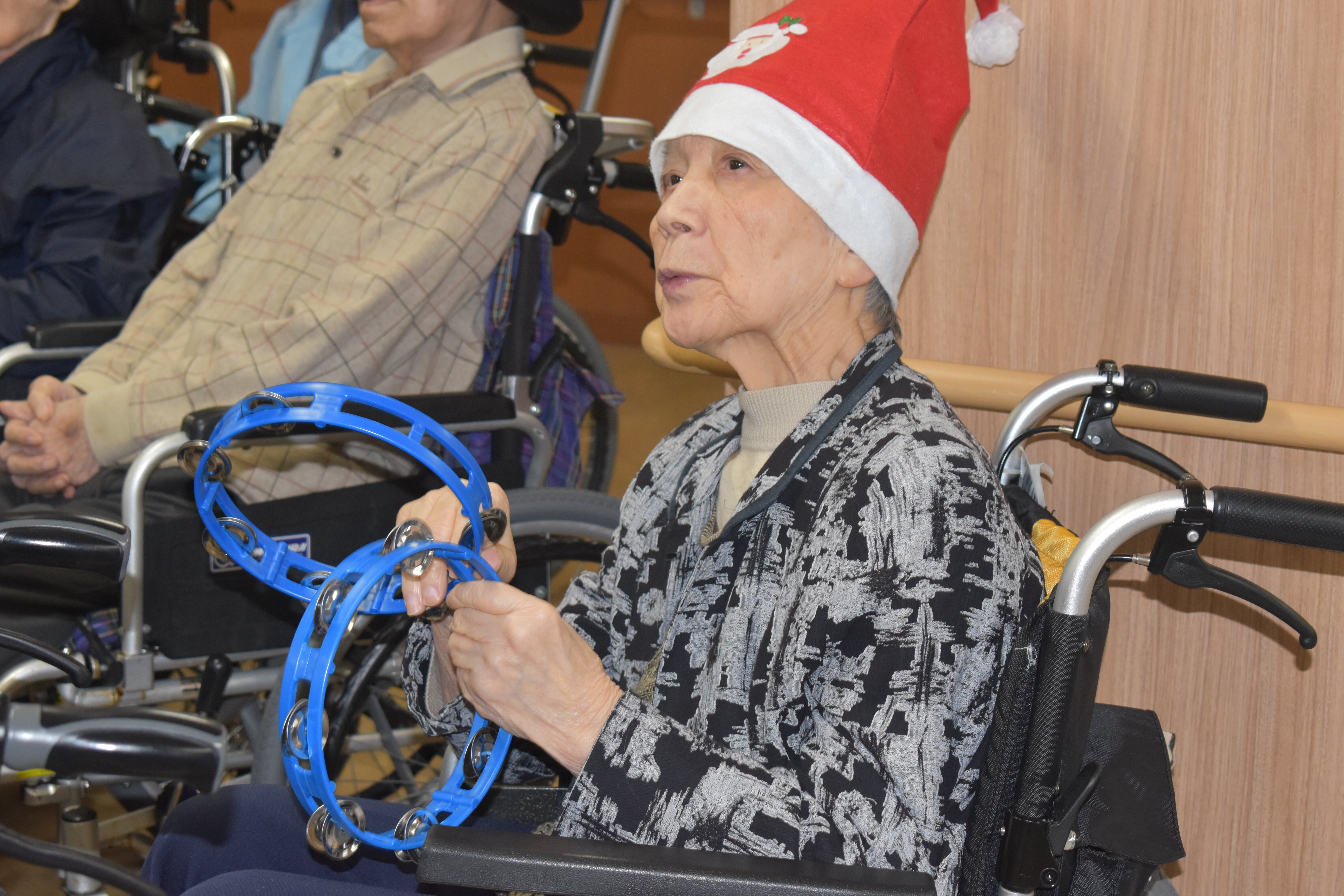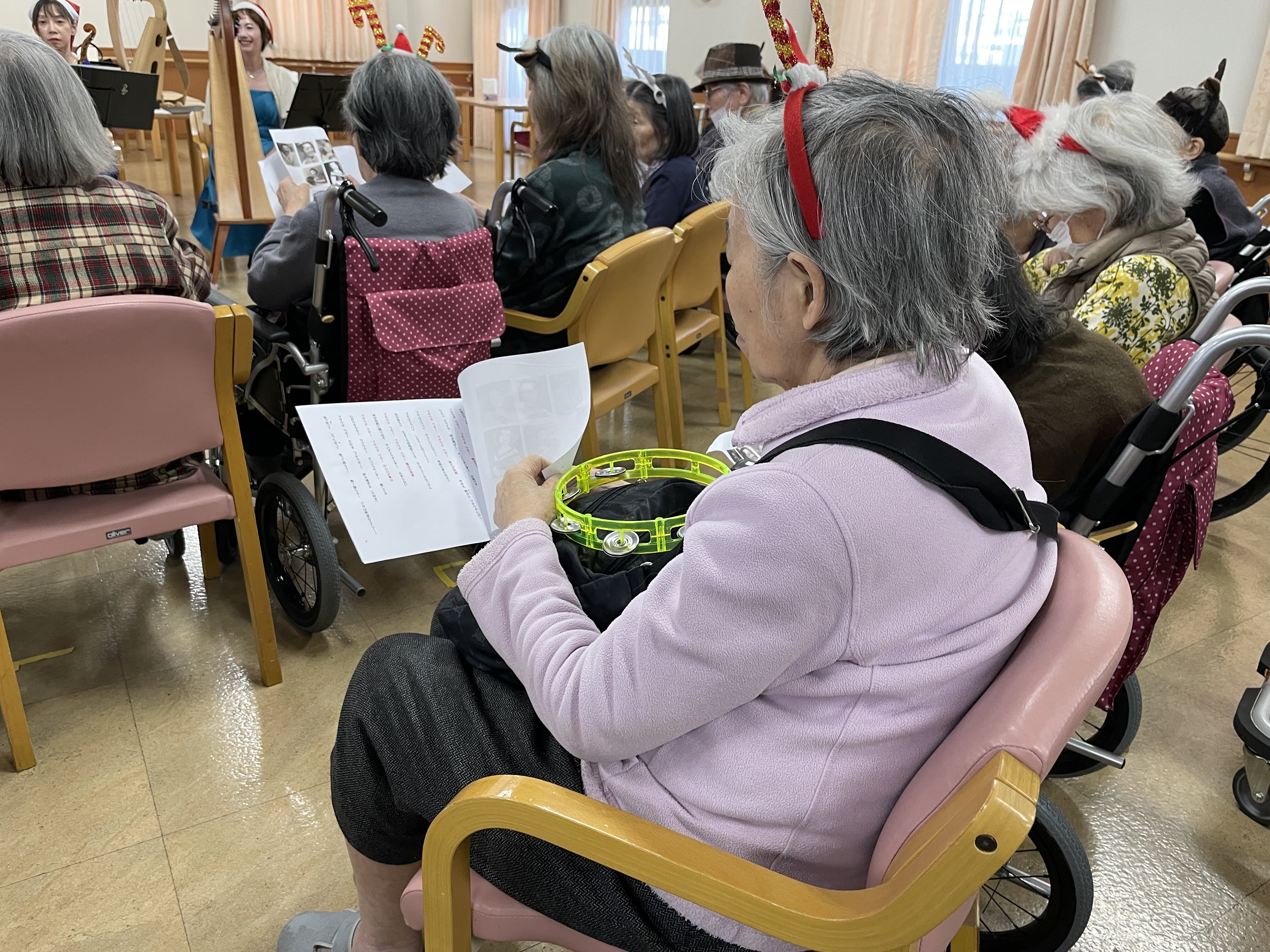 続いては、クリスマスメドレーです。『赤鼻のトナカイ』や『サンタが街にやってくる』を歌ってくださり、ご入居者はそれぞれが持っている楽器で参加しておられました。
