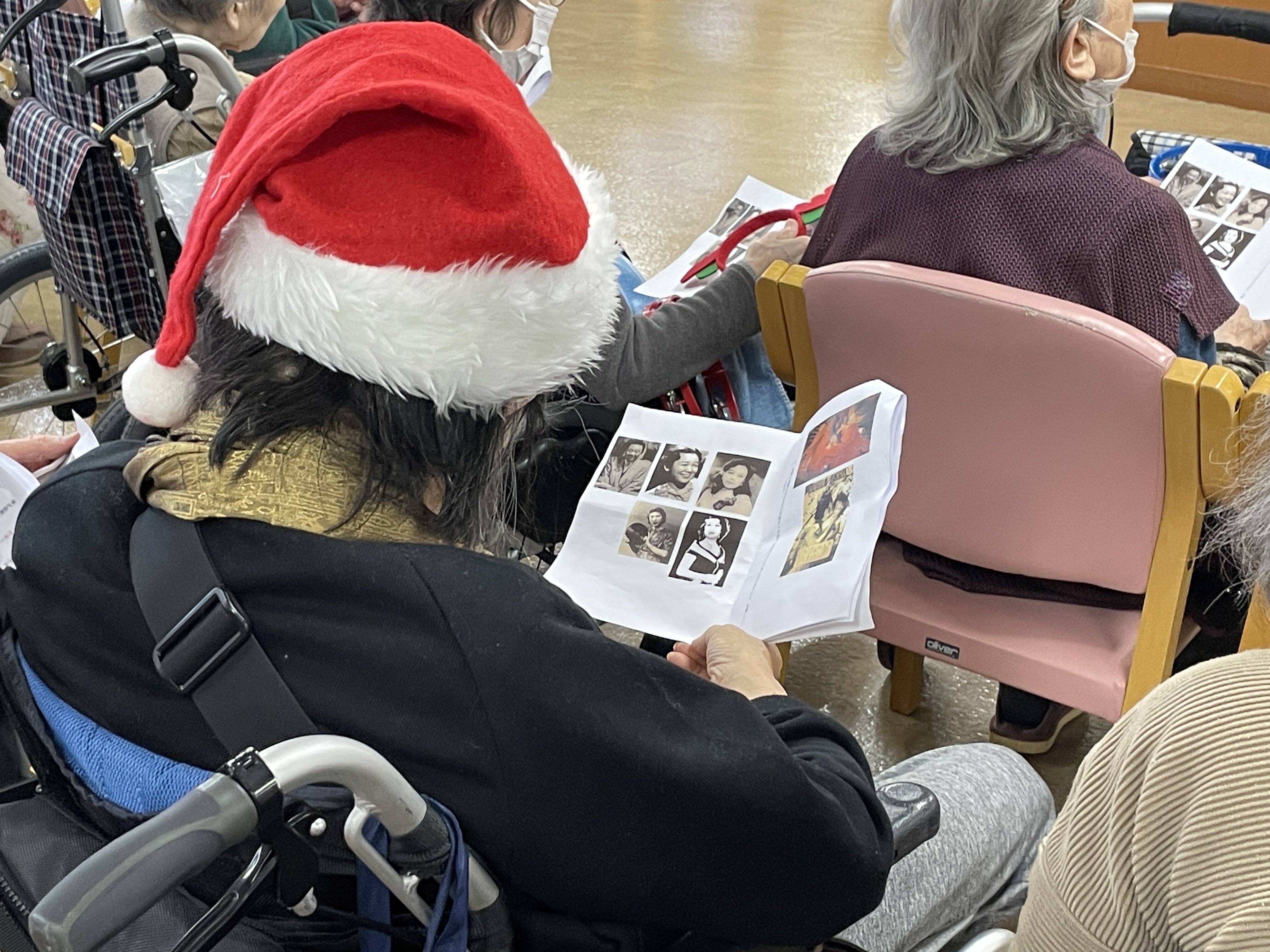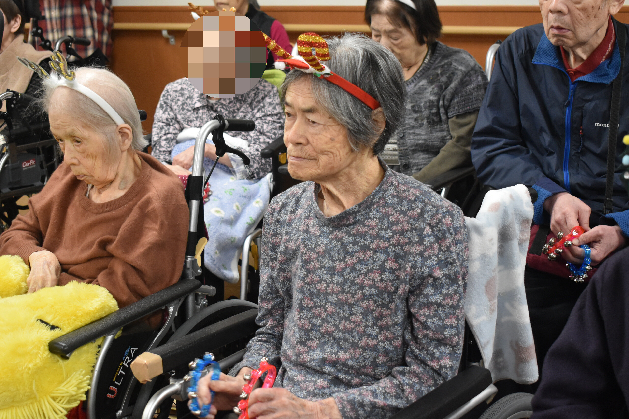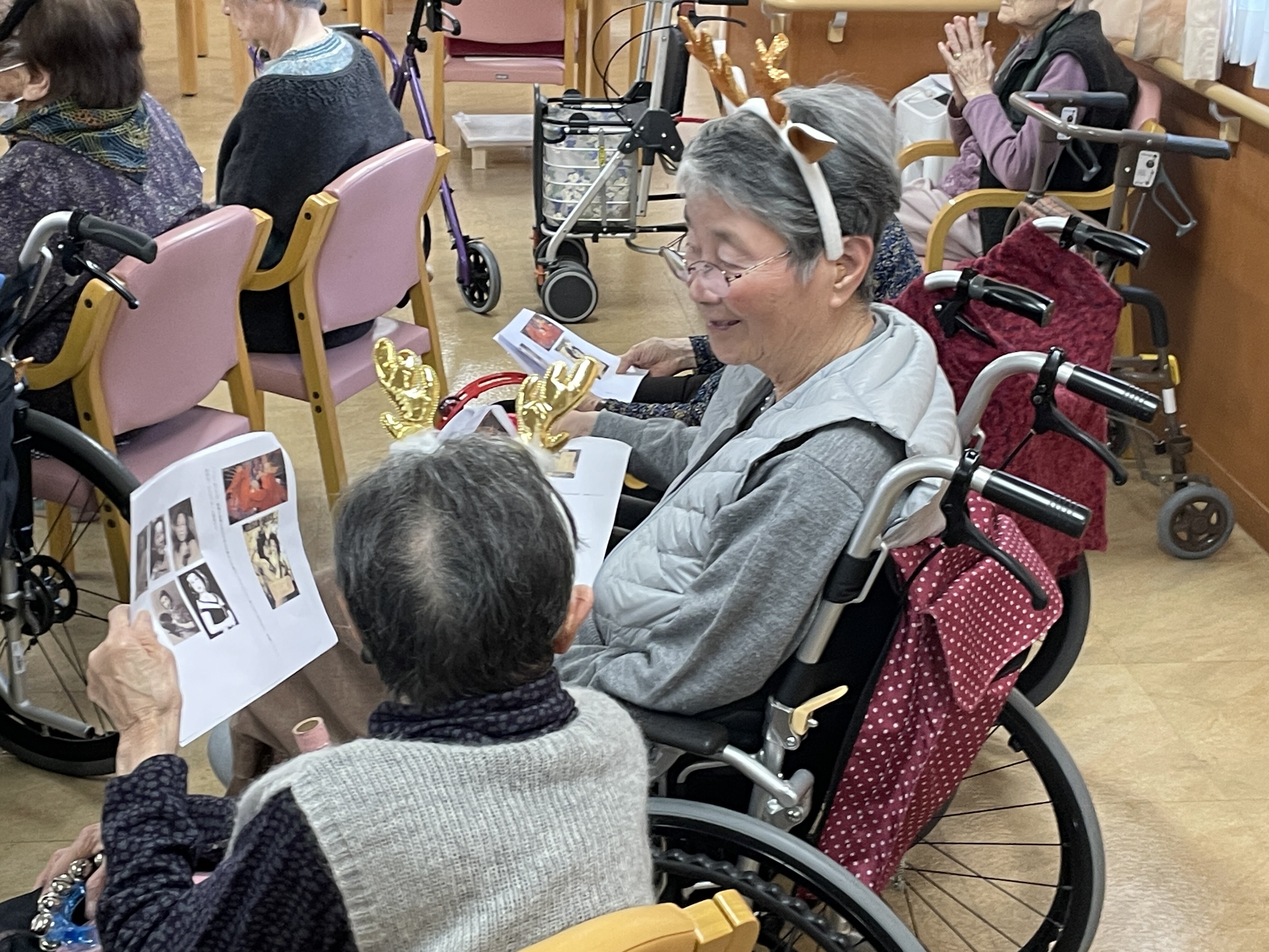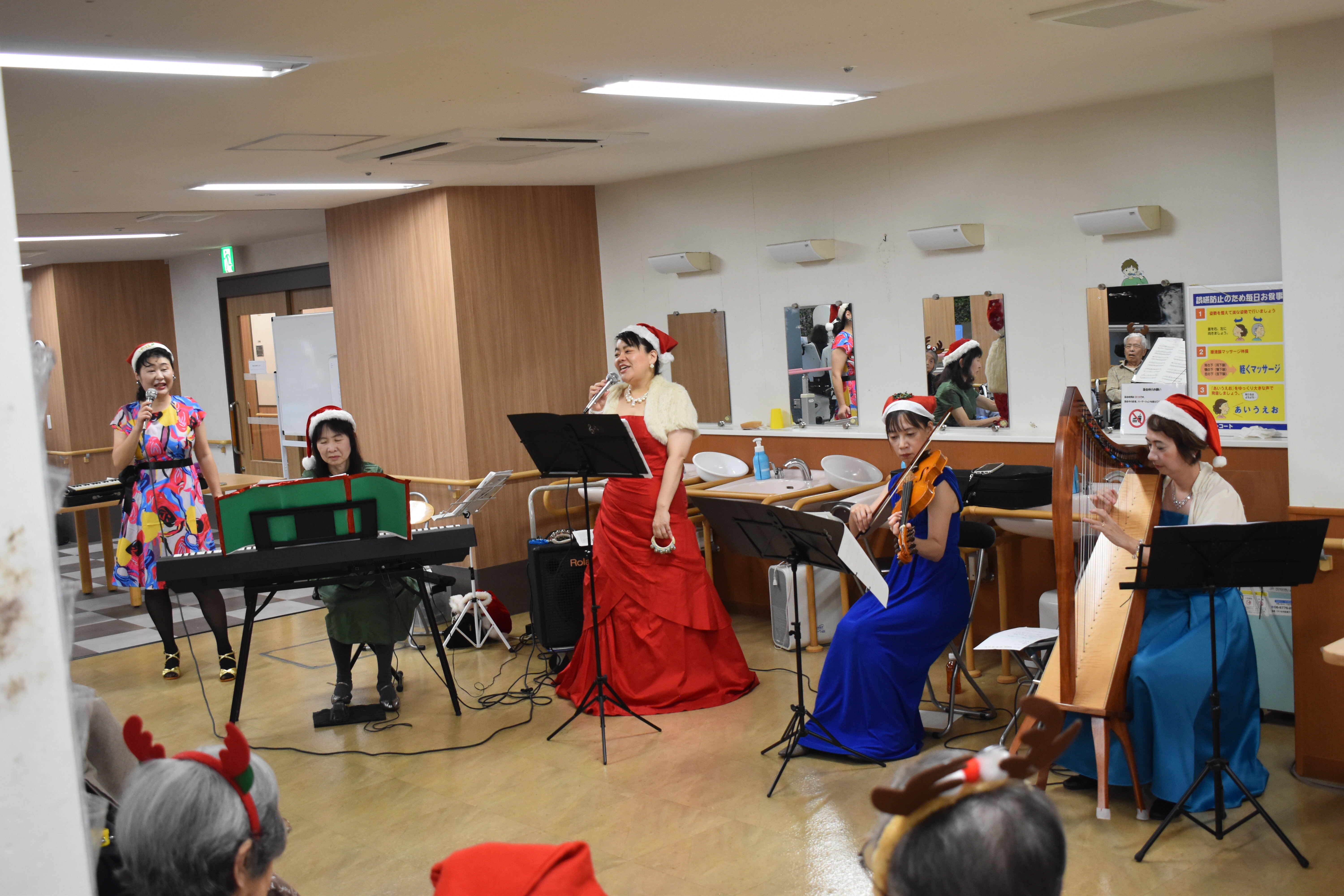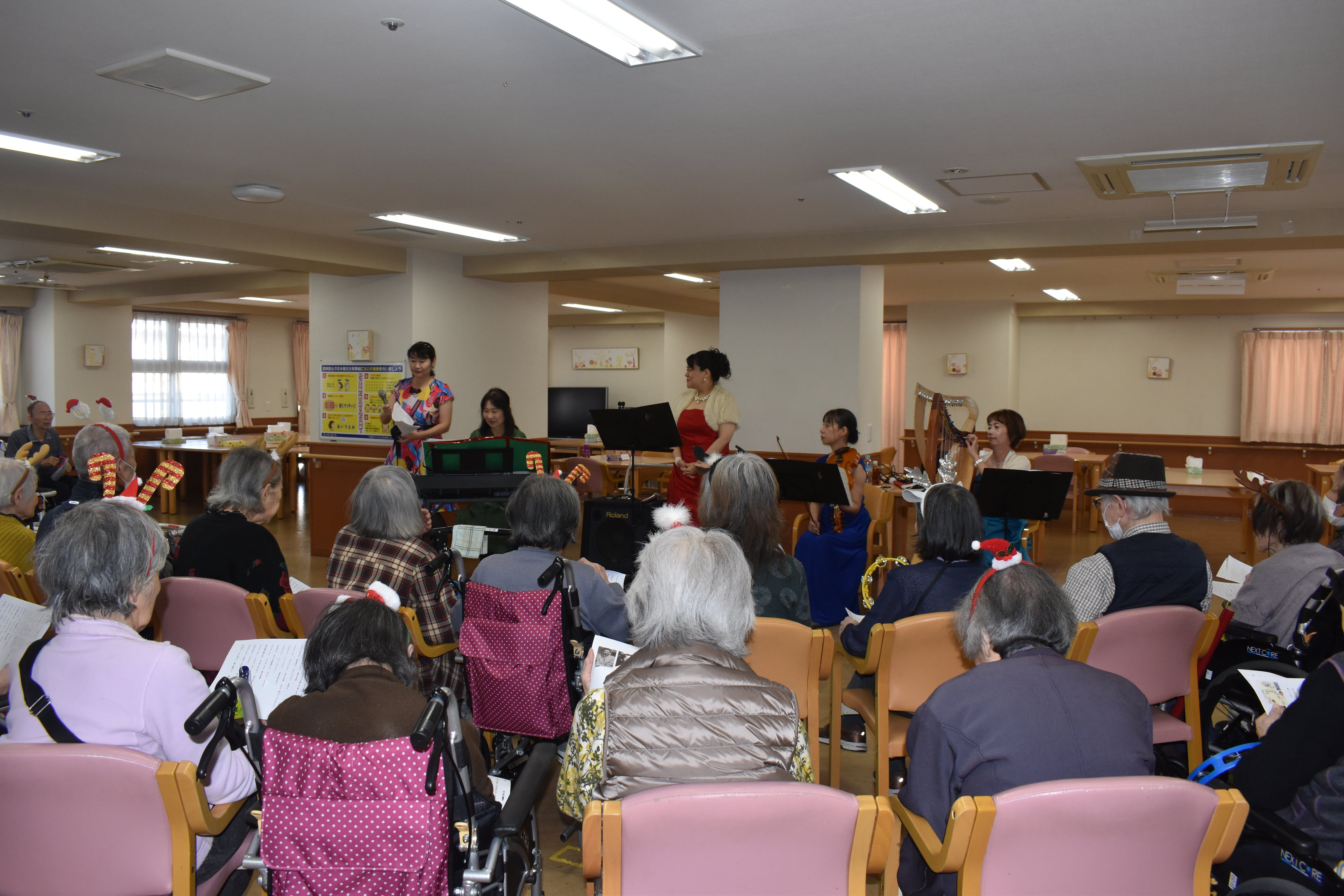 続いては、クリスマスメドレーです。『赤鼻のトナカイ』や『サンタが街にやってくる』を歌ってくださり、ご入居者はそれぞれが持っている楽器で参加しておられました。