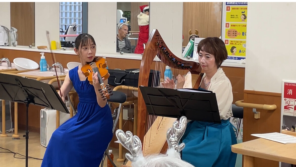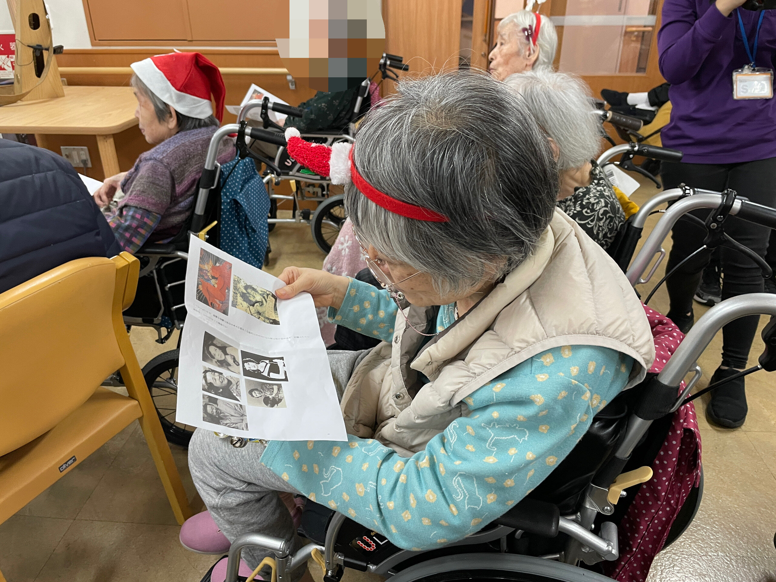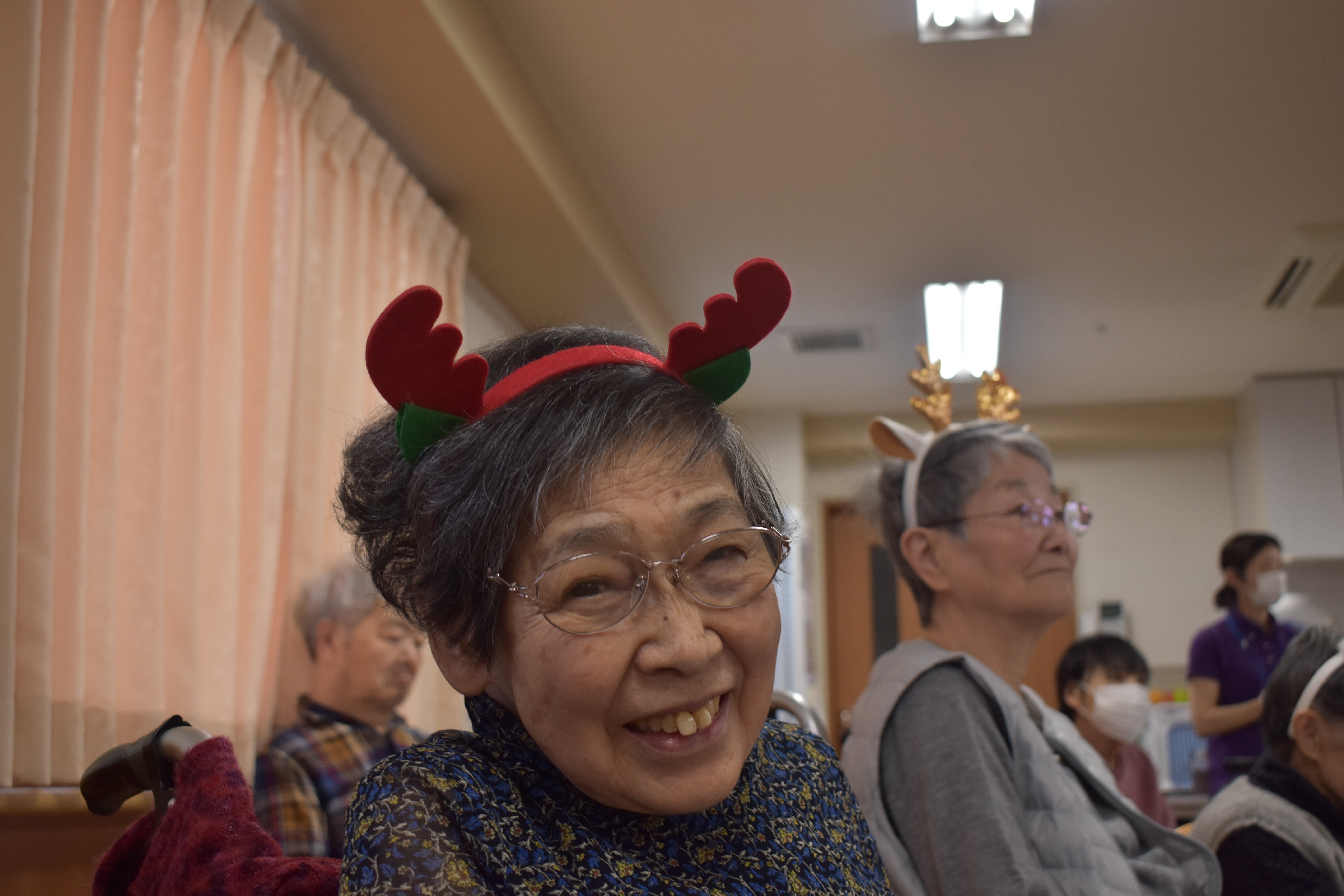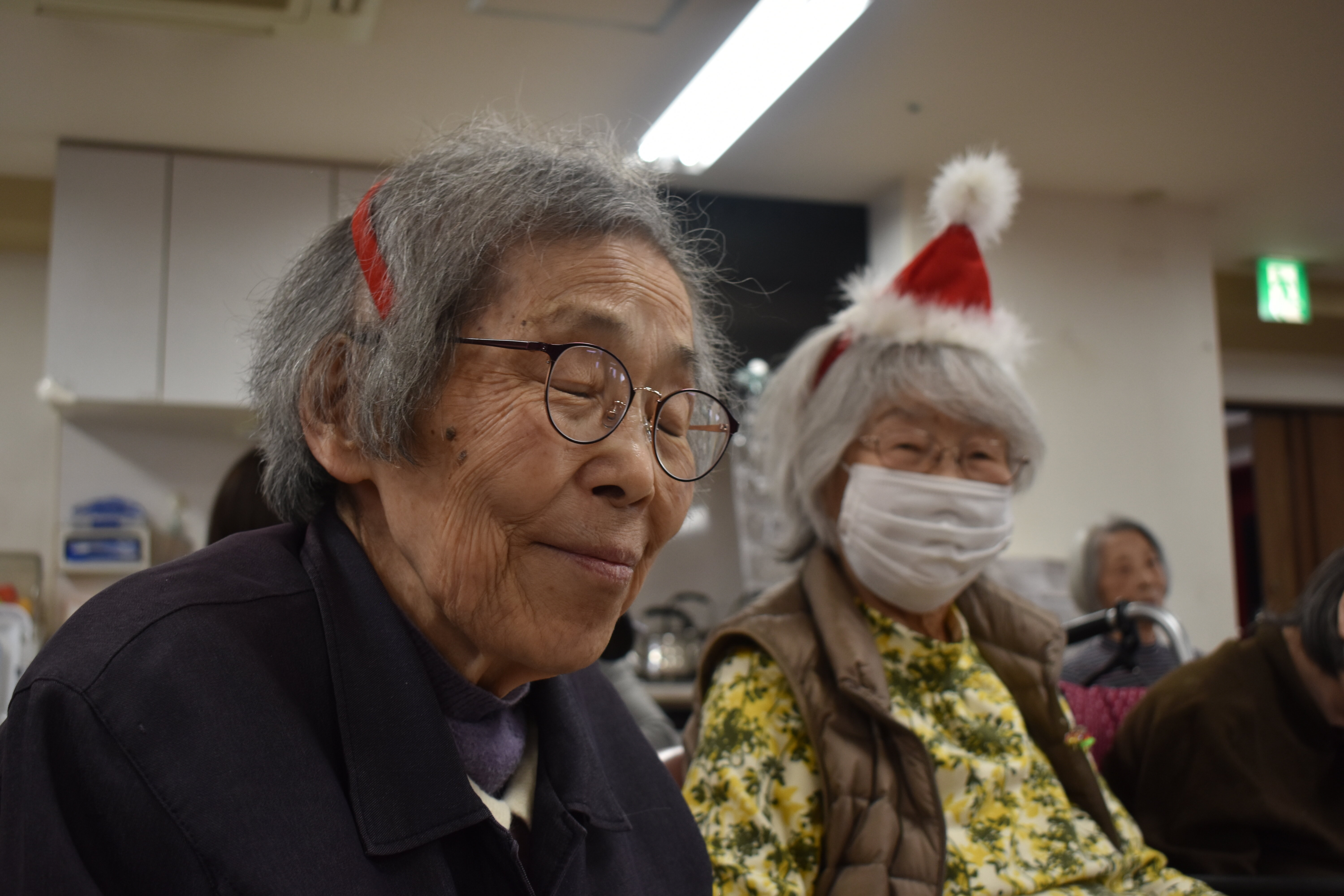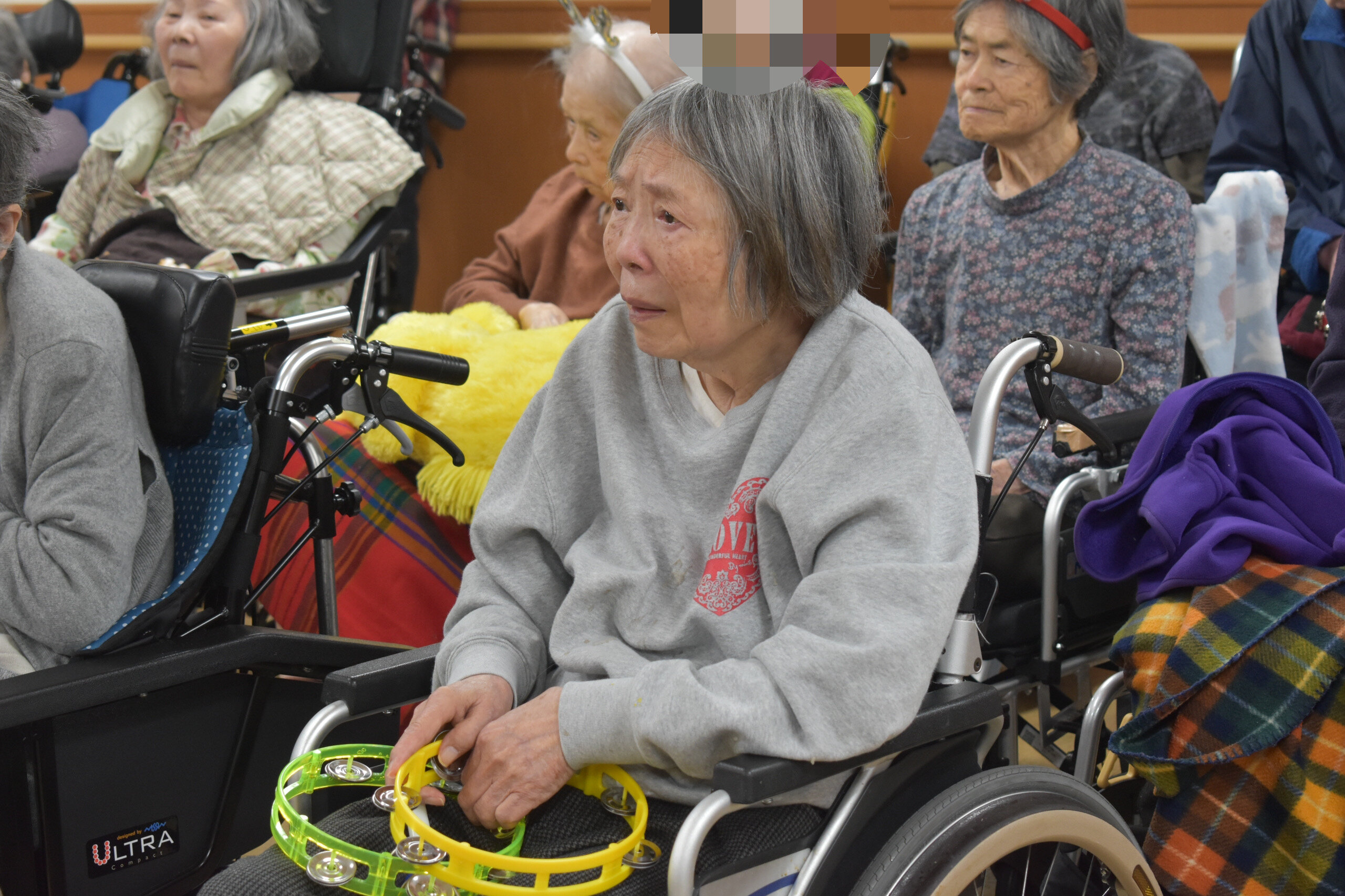 続いては、クリスマスメドレーです。『赤鼻のトナカイ』や『サンタが街にやってくる』を歌ってくださり、ご入居者はそれぞれが持っている楽器で参加しておられました。