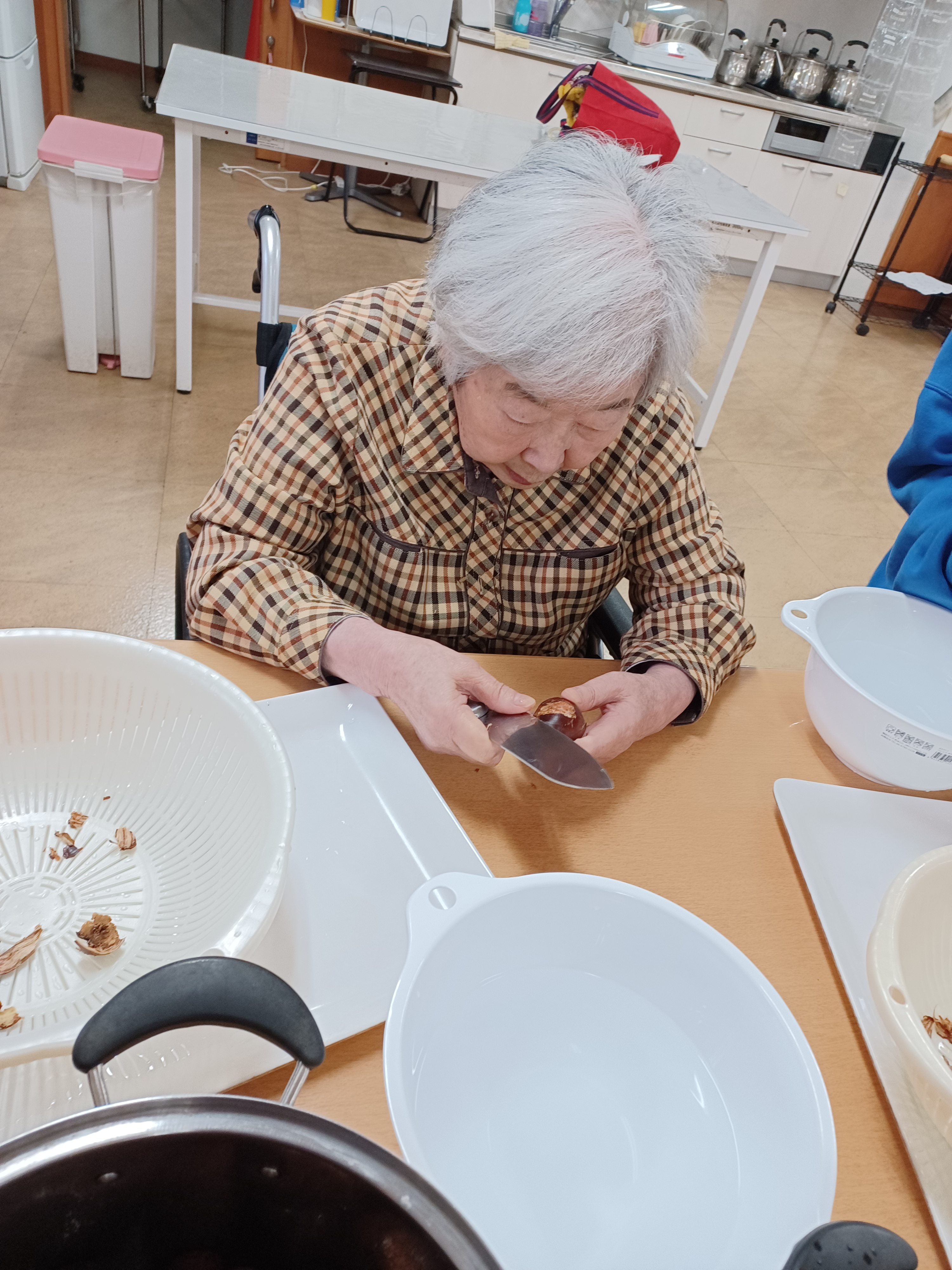 数名のご入居者に皮むきをお手伝いしてもらおうとお声をかけましたが、「今までむいてきました」「もういらん」と栗の皮むきは力がいるため、断られ続けで、やっとむいてくださると仰ってくださった方も、力のいる作業だからか当日お声かけに行くと、「やっぱり、忘れてなかったの?」と苦笑されていました。