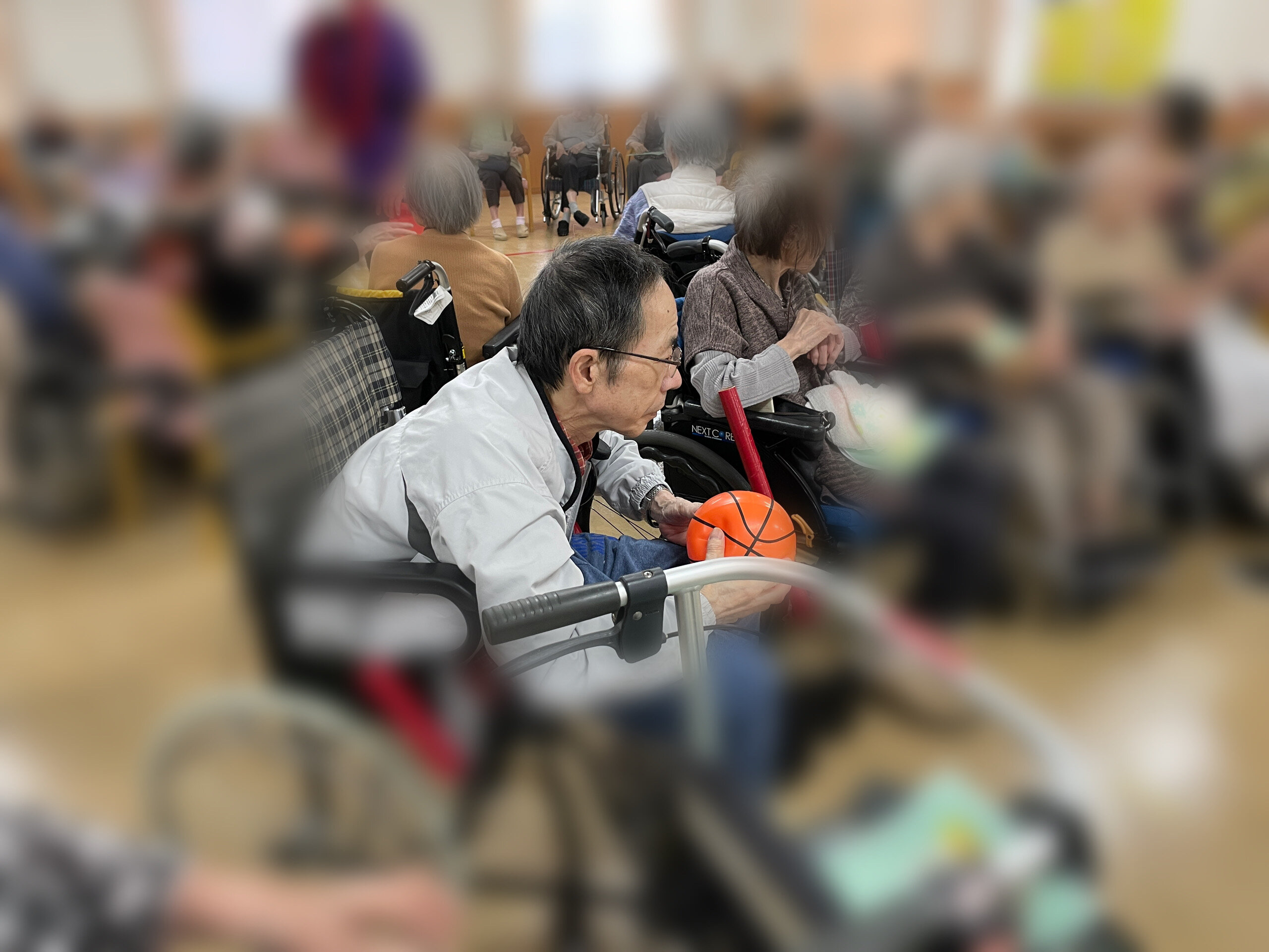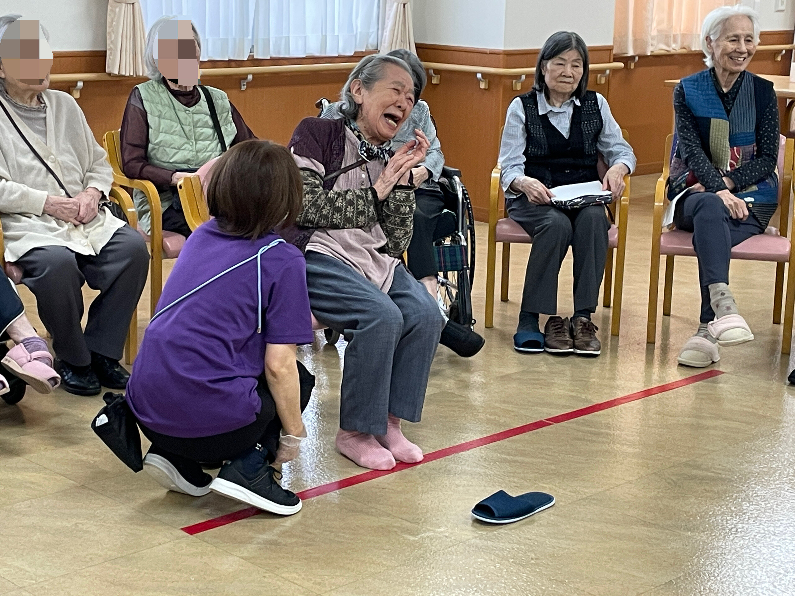 選ばれたご入居者にスリッパを履いていただき、どれだけ遠くに飛ばせるかの対戦です。合計8人のご入居者に参加していただきました。その場に落ちただけの方、びっくりするくらい遠くに飛ばされた方、スリッパではなく靴を飛ばした方...笑わせていただきました(≧▽≦)