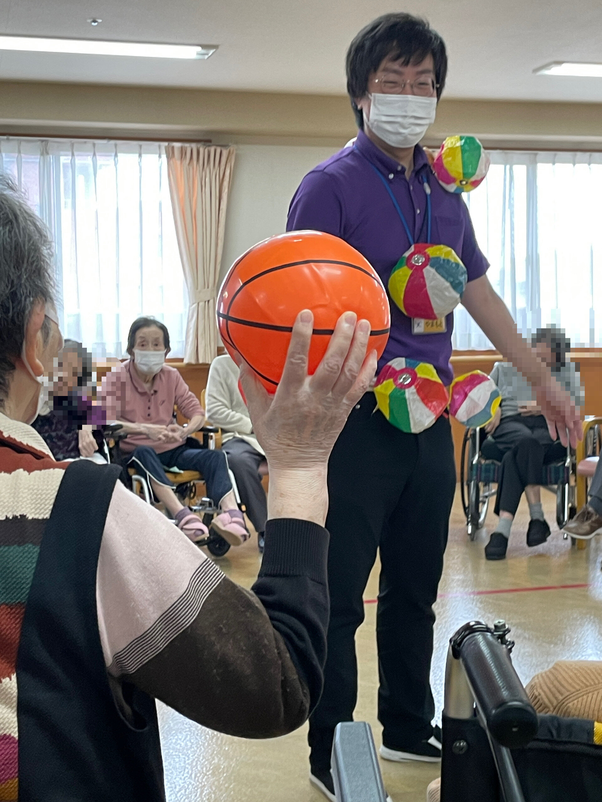 代表者に紙風船をたくさんつけ、ご入居者にボールを投げて割っていただきます。先に全部の紙風船を割ったチームの勝ちです。