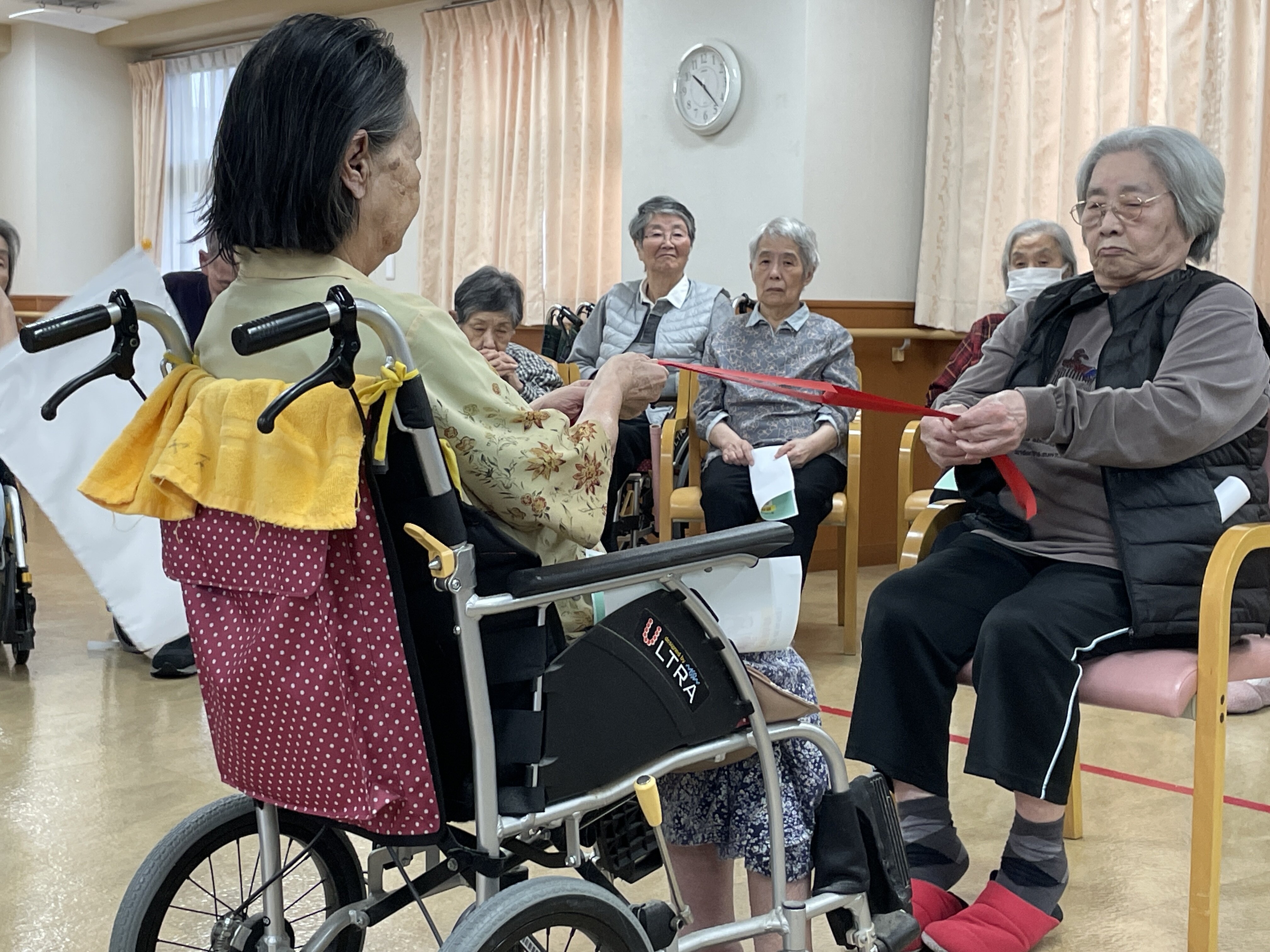 2本の長い紙を使って引っ張りあいっこをしていただき、紙が切れなかった方の勝ちです。合計8人のご入居者に参加していただきました。