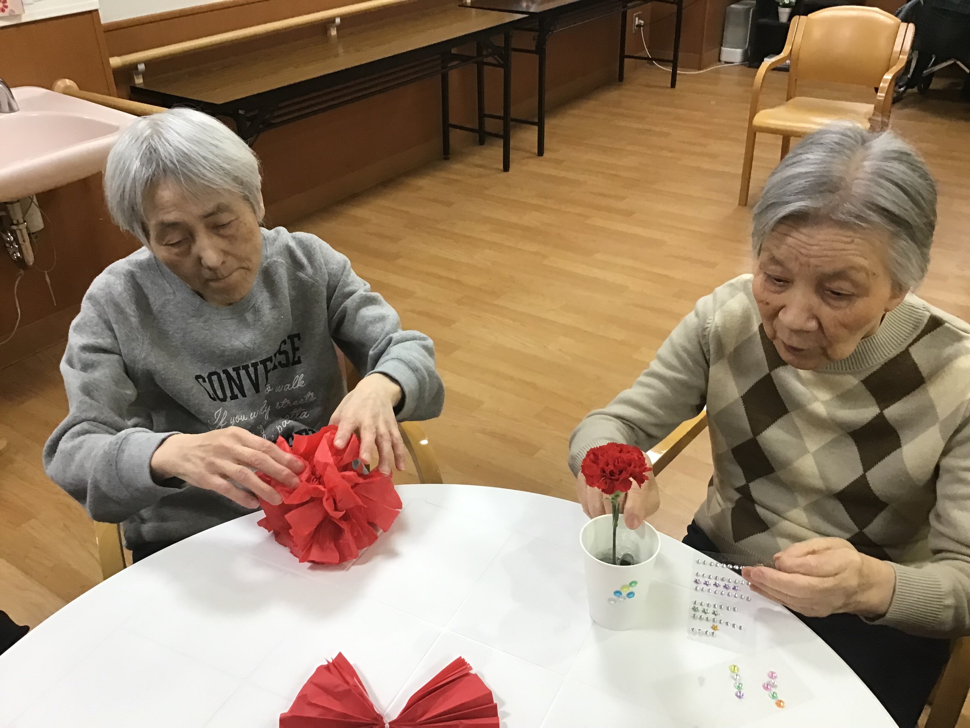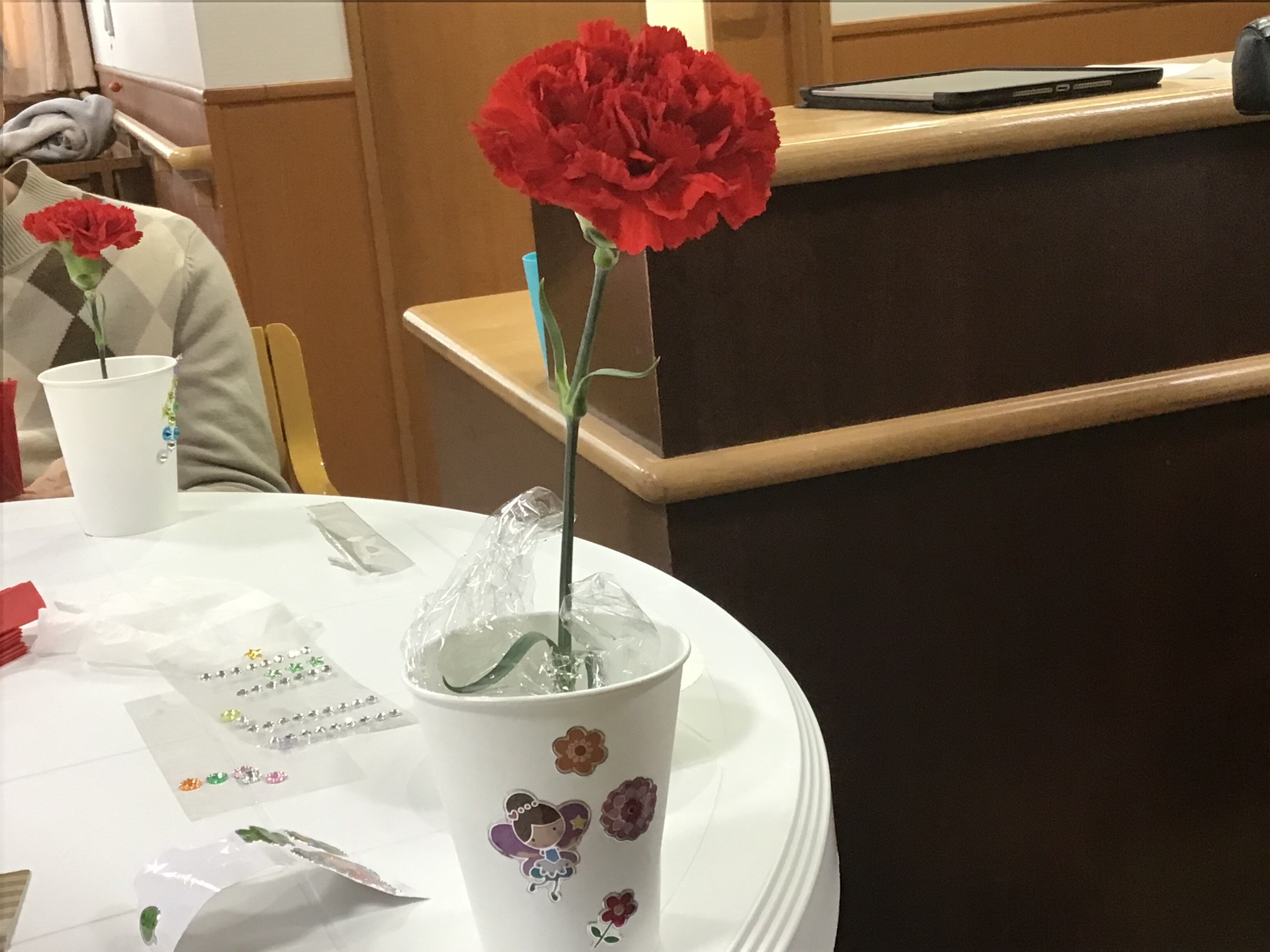 ご入居者様にカーネーションで生け花と施設の飾りを折って頂きました。花の長さはスタッフが行い、生け花とシールもご自身で貼って頂きました!!