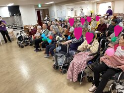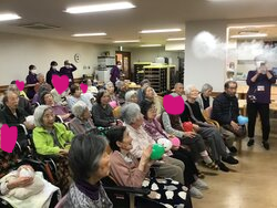 午前の部は1~3階のご入居者たちです。ポスターを見て、前日の夜には前夜祭と称して夕食後から童謡を歌ってたとの事。