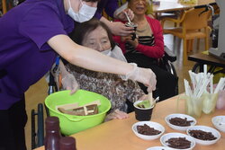低層階フロアのなかにはご自分でソフトクリームを作ることが困難な方がいらっしゃるため、そういった方々には職員が何味が好きか、トッピングは何が良いか聞きながら一緒に作らせていただきました。