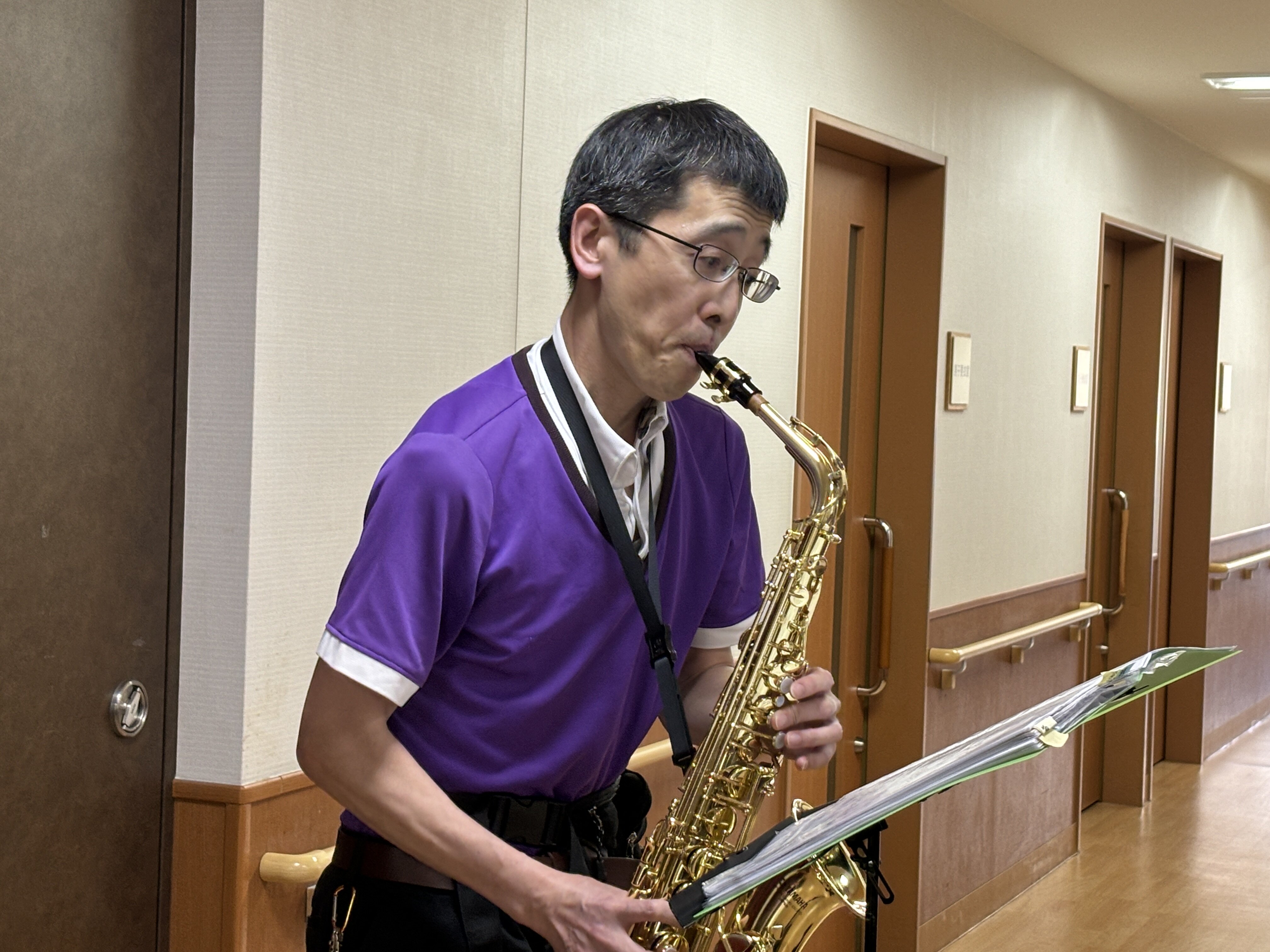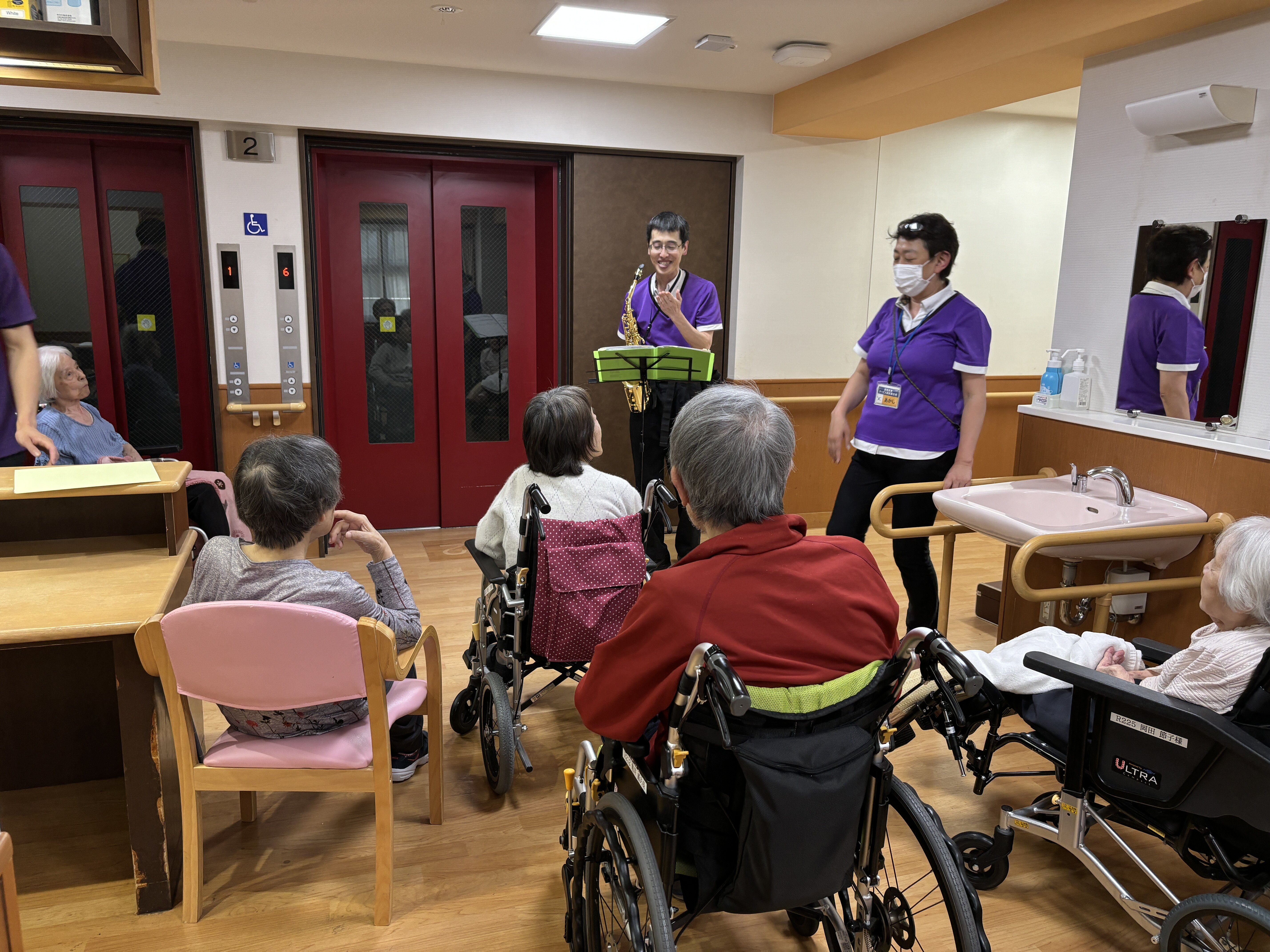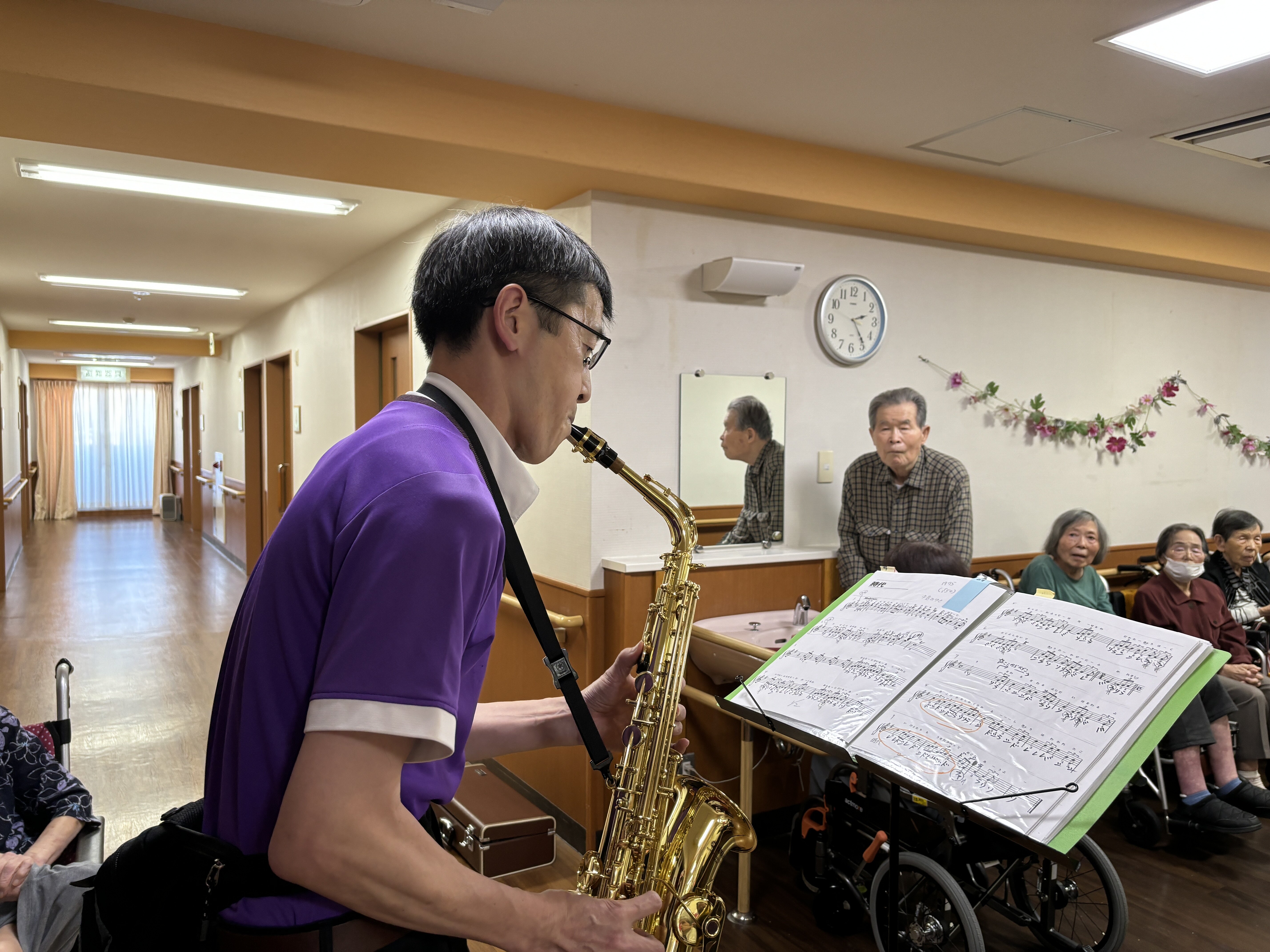 サックスの演奏でイントロクイズ!皆さま歌えるのに曲名がなかなかでてきません。「聞いたことあるのに、曲名がでてこない」と悔しそうにされている方もいらっしゃいました。クイズのはずが合唱になってる曲もありました笑 サックスの演奏に聞き惚れておられる方も。
