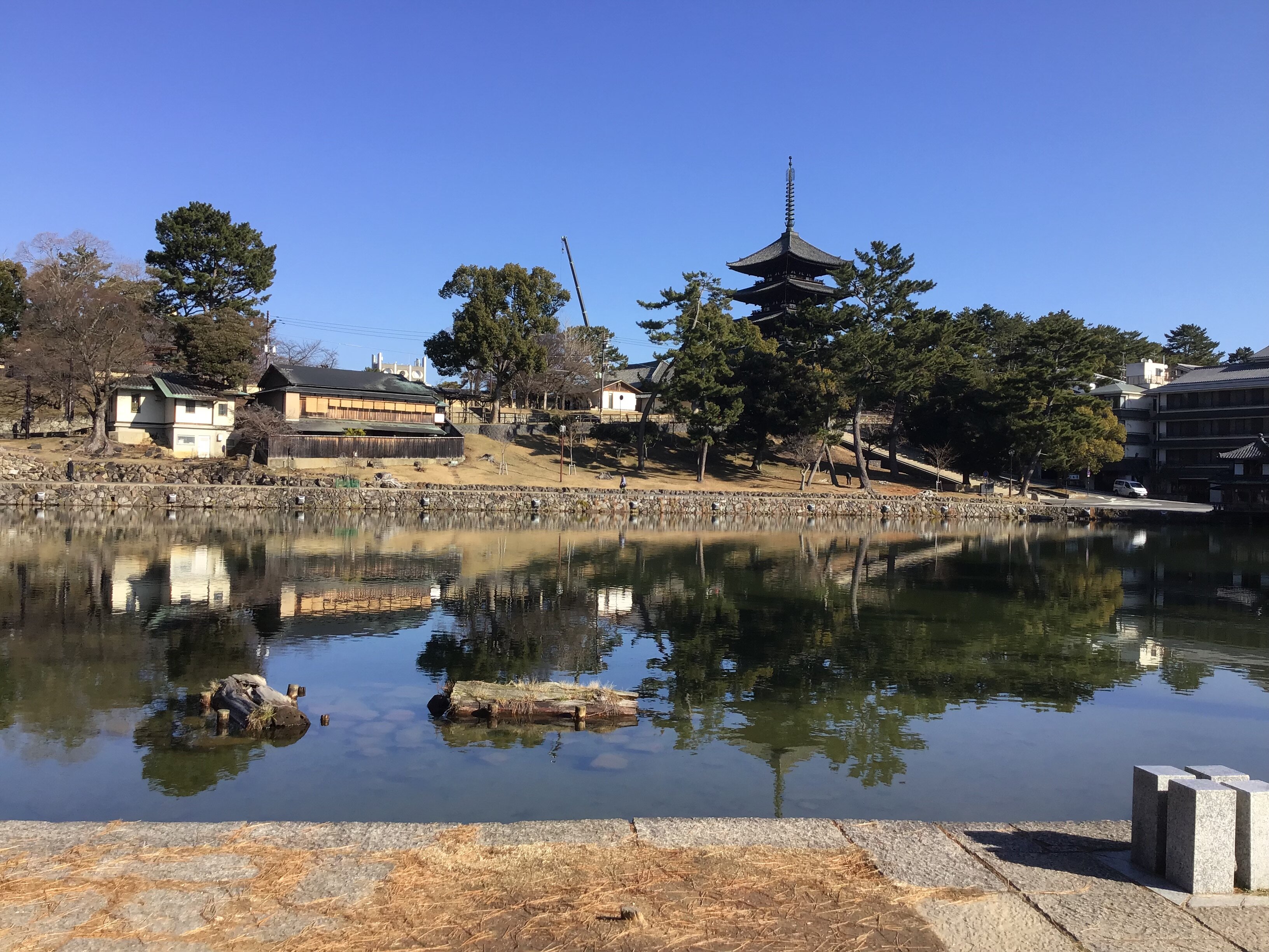 では、猿沢池に向かって Let's go!!(猿沢池、池から眺める五重塔(右))