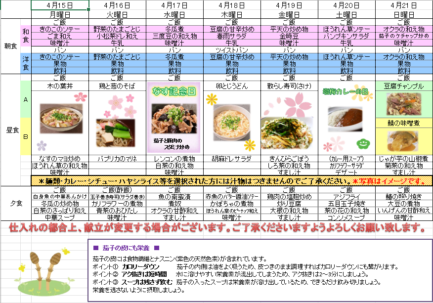 ということで「茄子と豚肉のスタミナ炒め」が昼食に提供されます(≧▽≦)