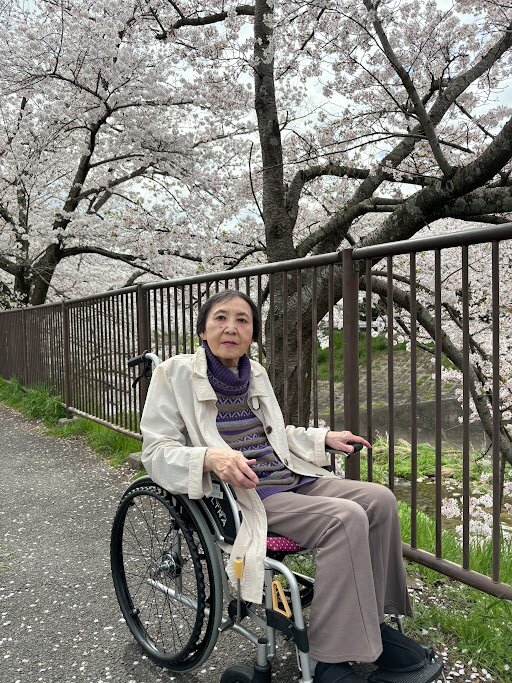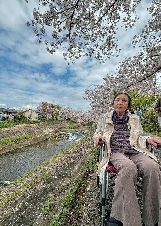 歩行訓練として歩いて行きたいところでしたが、歩いて行くには遠いため車椅子での移動です。施設から往復30分ほどの距離にある佐保川までお花見です。