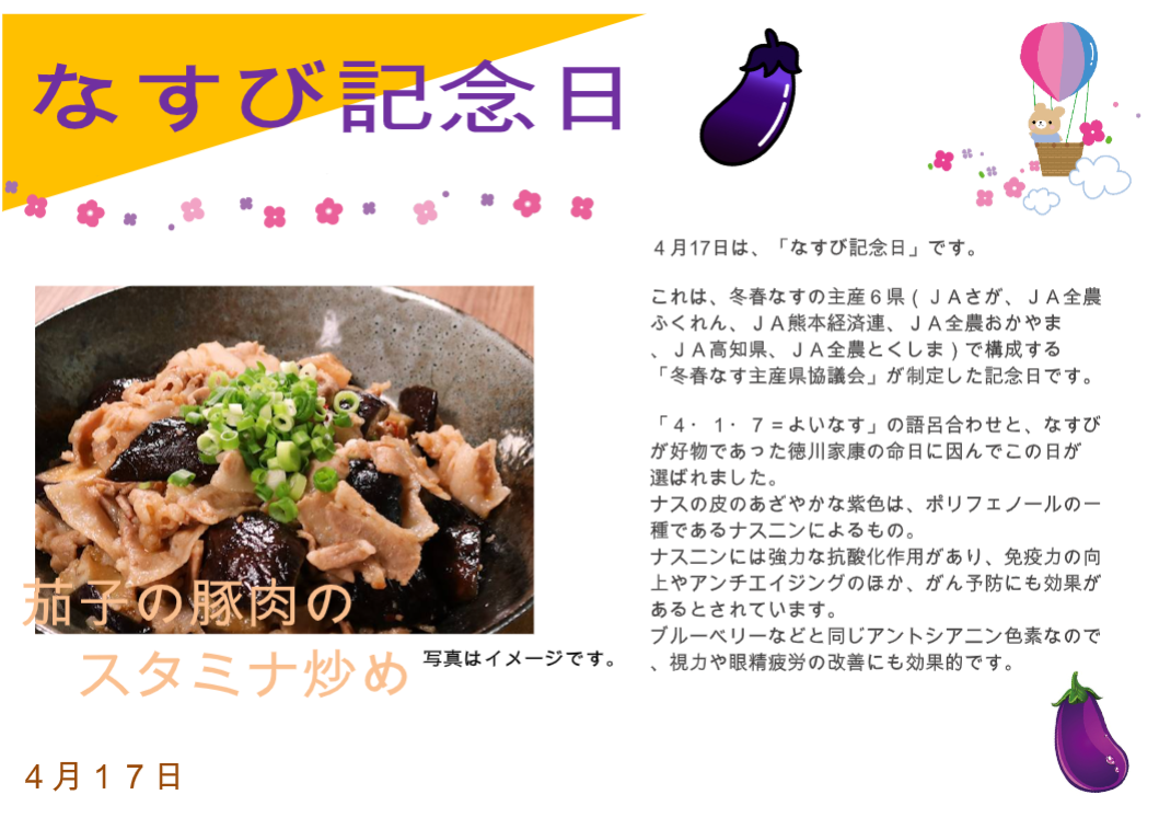 4/17は『なすび記念日』です。皆さま知っておられましたか?私は初めて聞きました!