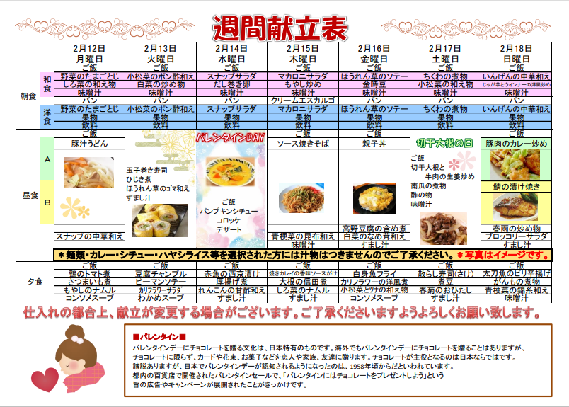 昼食にバレンタインDAY特別メニューが提供されます。