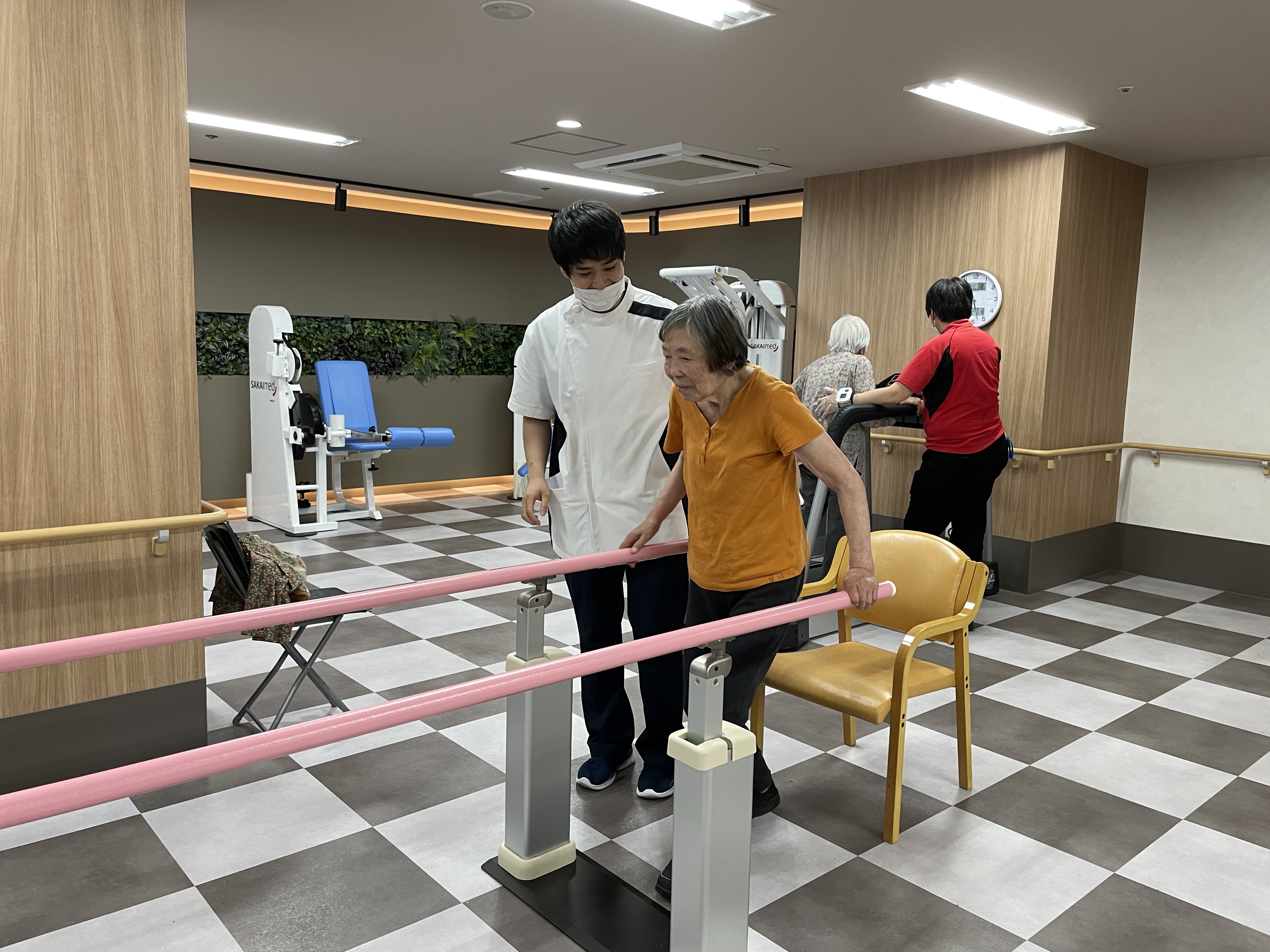 目的:動作訓練(起立・立位保持・歩行)を行なうことによって転倒予防、筋力・筋持久力・バランス力のUP、運動調整