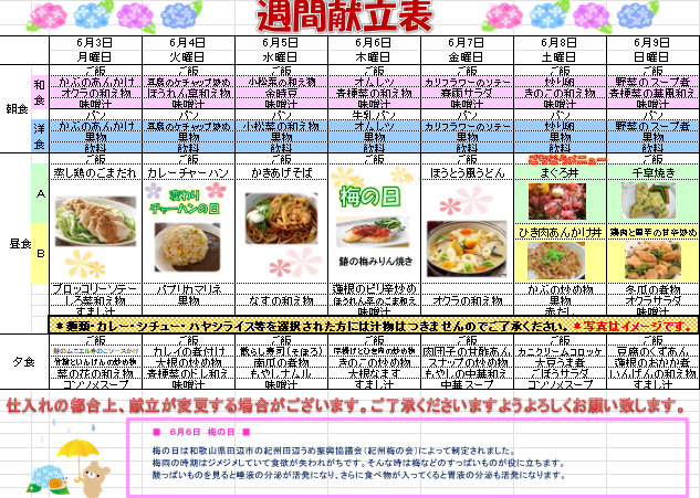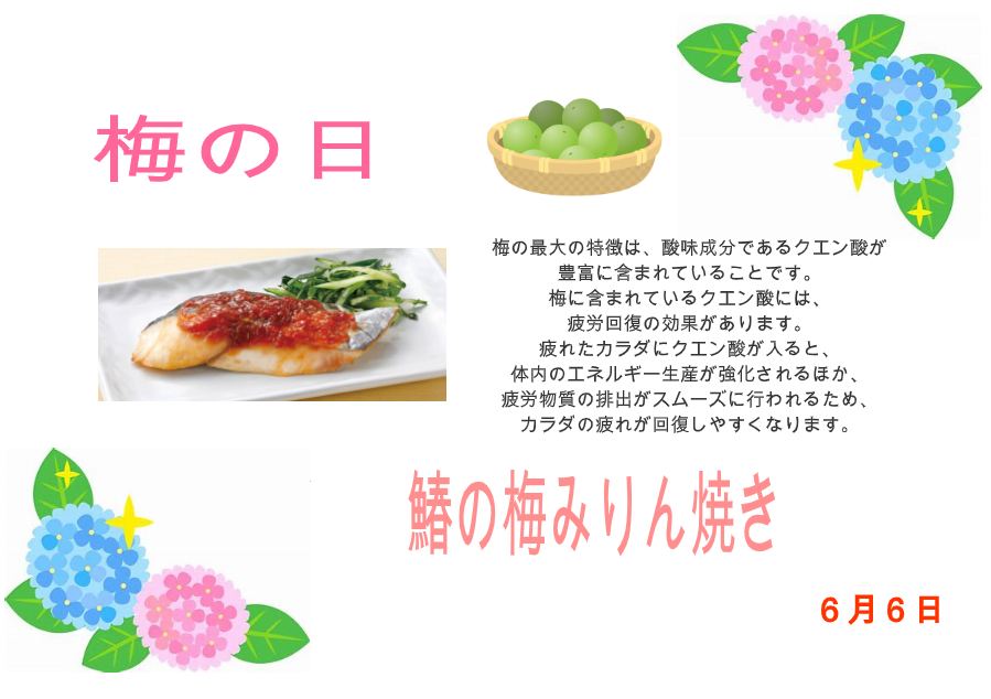 6/6は『梅の日』。昼食で「鰆の梅みりん焼き」が提供されます。