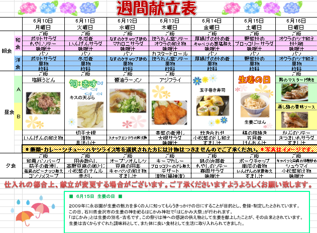 メニューを見るまで『生姜の日』があることを知りませんでした。皆さまは知っておられましたか?由来は6/10~6/16の献立メニューのブログに載せています。是非そちらの方もご覧ください(≧▽≦)