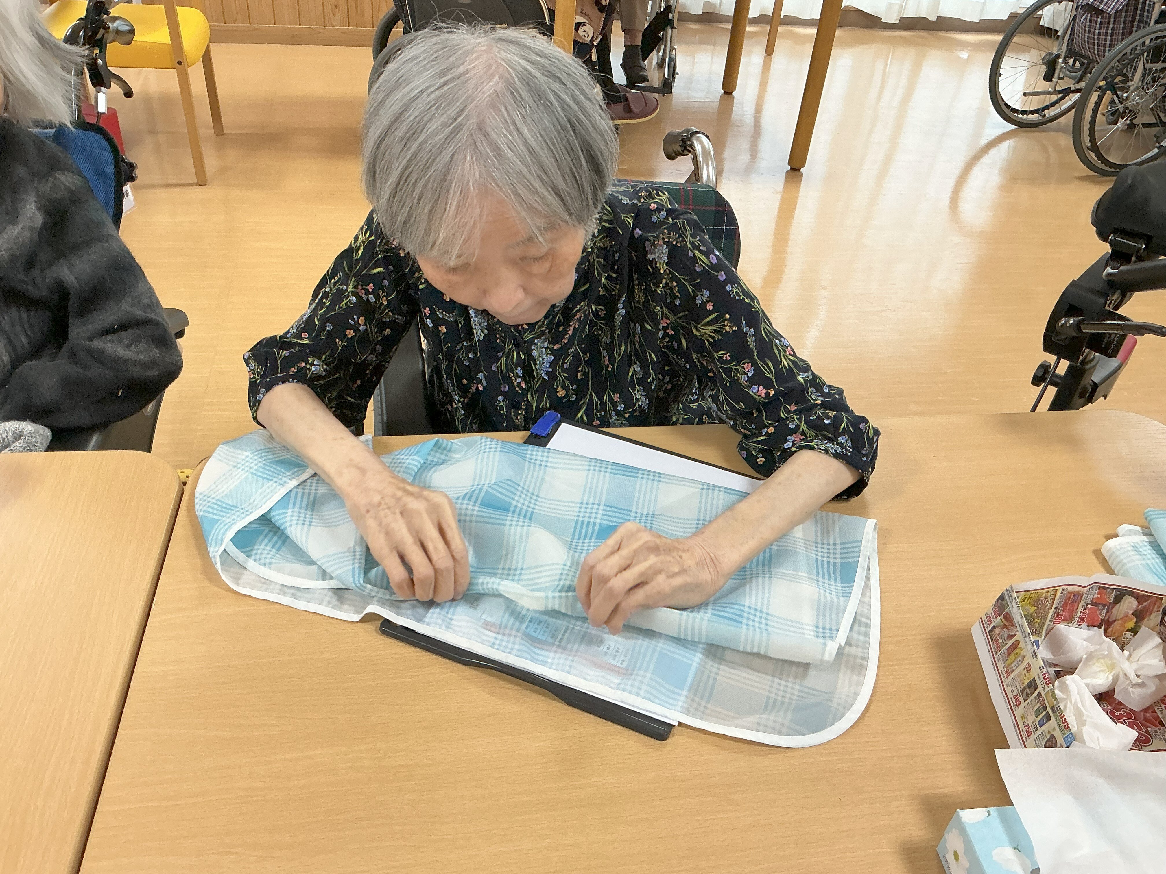 食事の際に使用するエプロンをご入居者のH様が挑戦しました!