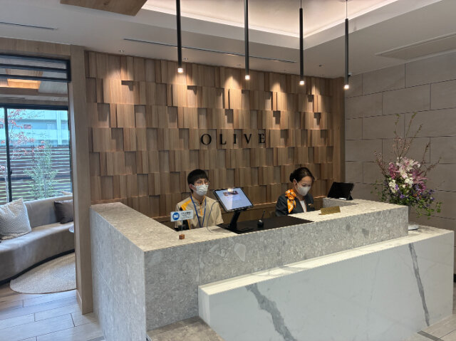 「OLIVE」のロゴが輝く受付では、今日もスタッフが元気にご入居者やご家族をお迎えしています。