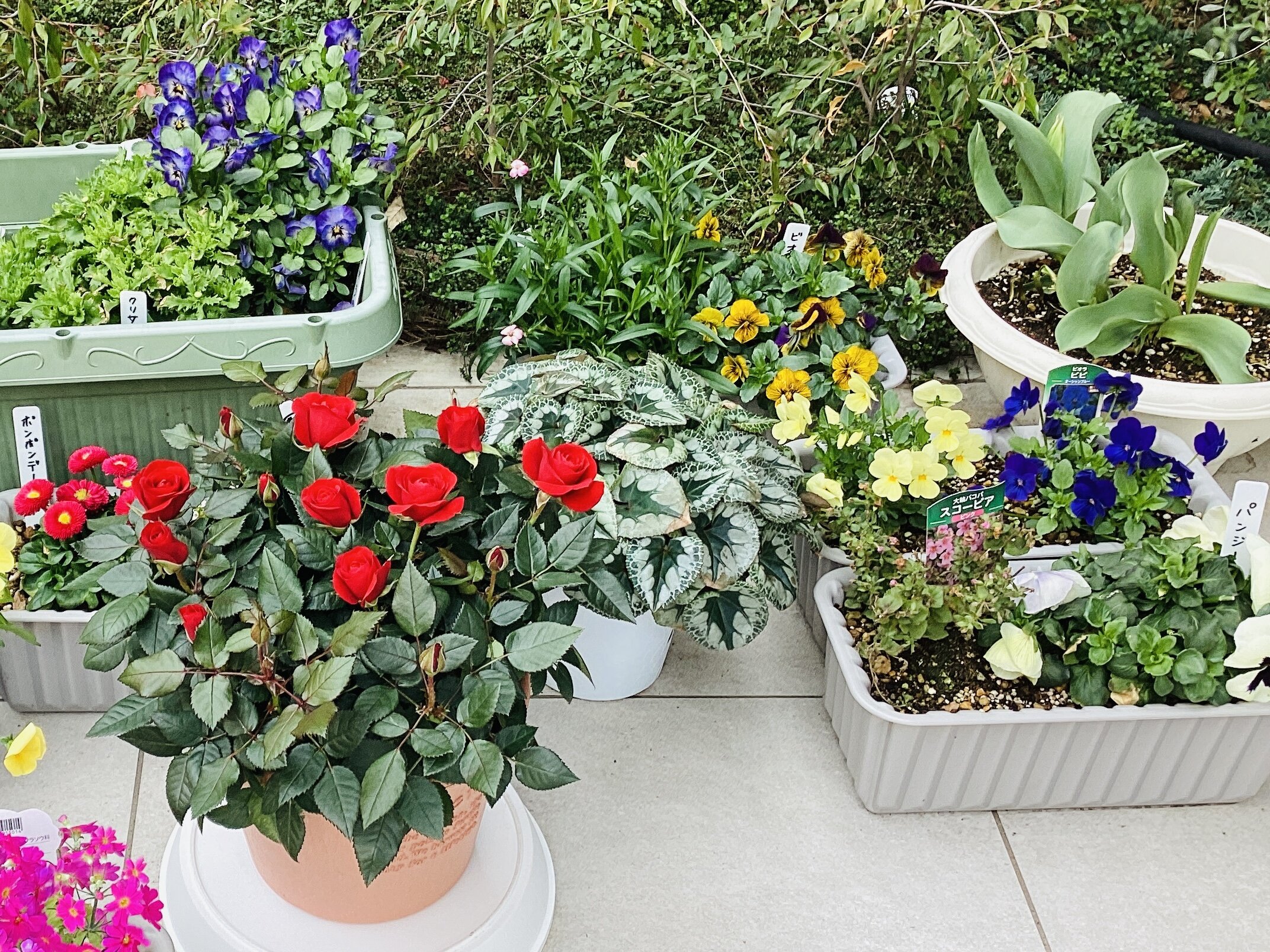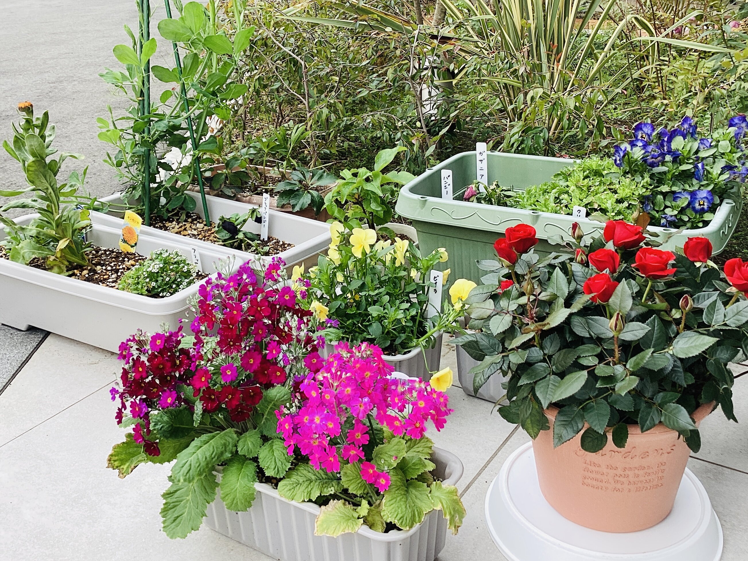 パンジーやビオラなど今までの色とりどりのお花たちと一緒に皆様を賑やかにお迎えしています^^