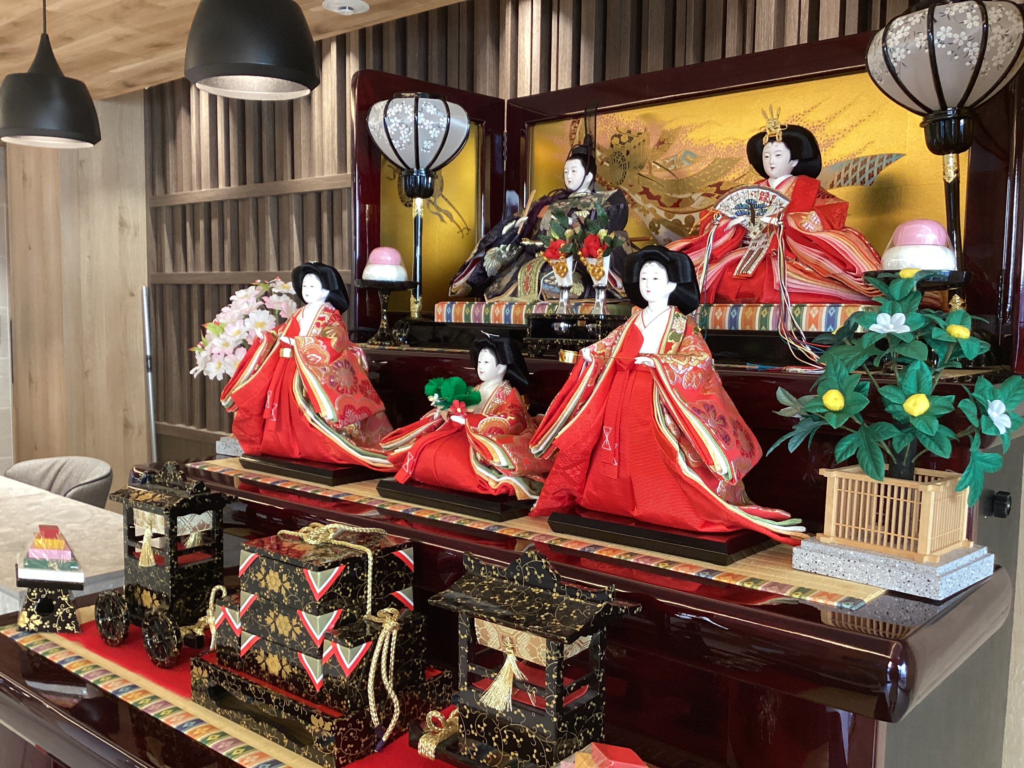 玄関入ってすぐのエントランス(受付横)に三段飾りの大きなひな人形を飾っております!(*^-^*)