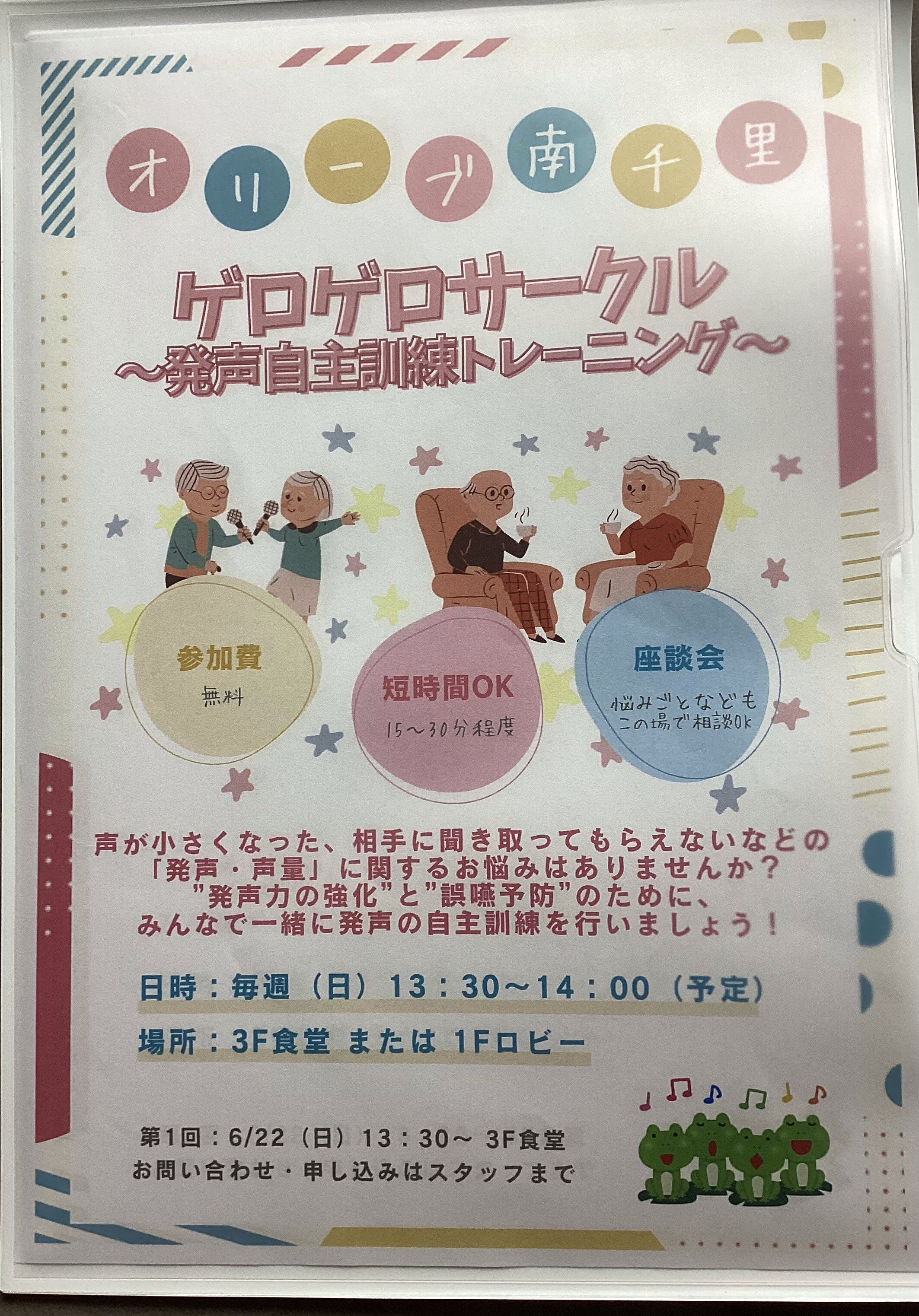 オリーブ南千里では、ご入居様の提案で【ゲロゲロサークル】を開設いたしました。