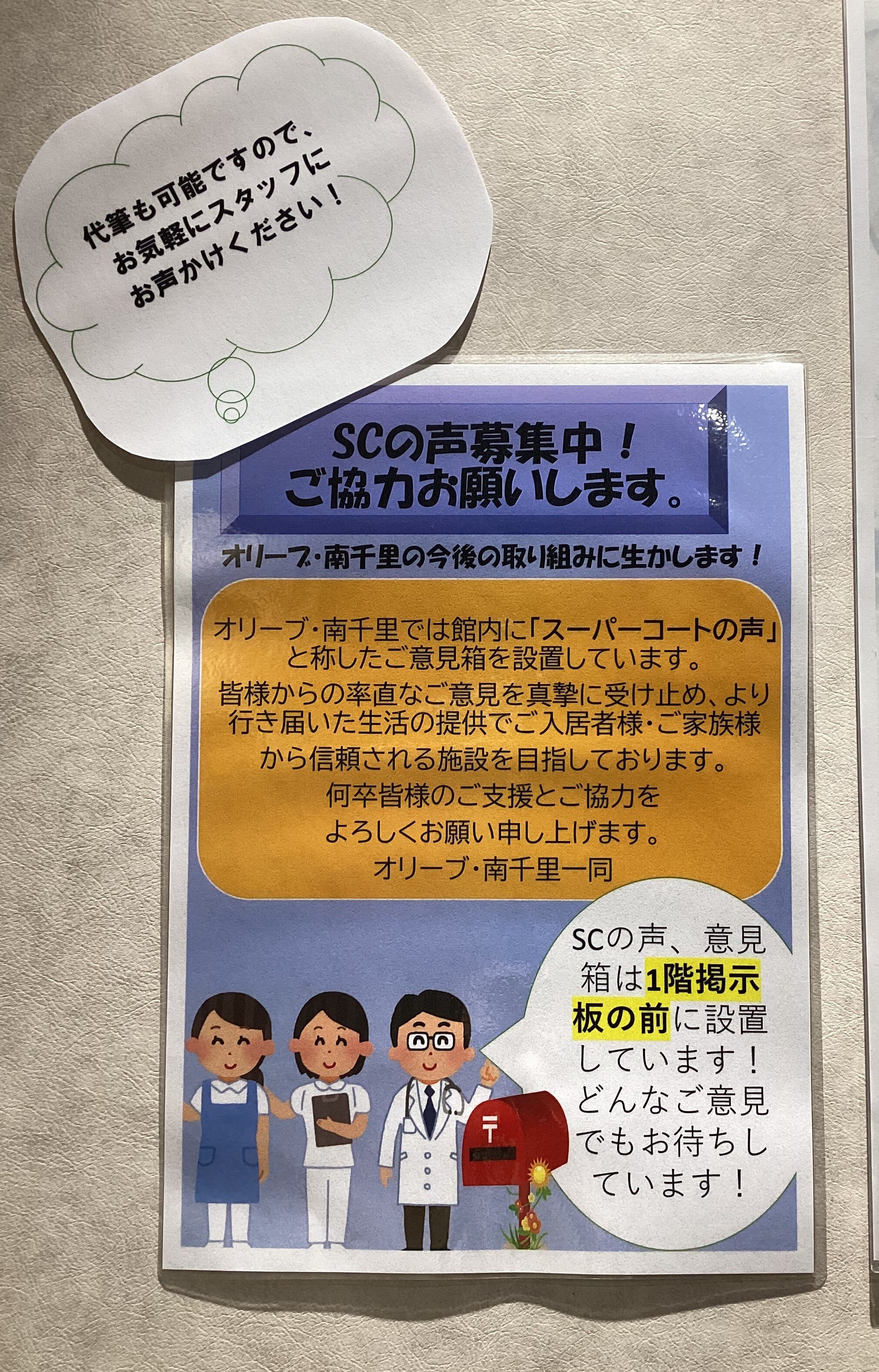 一階掲示板前に【スーパーコートの声】と称した意見箱を設置しています。