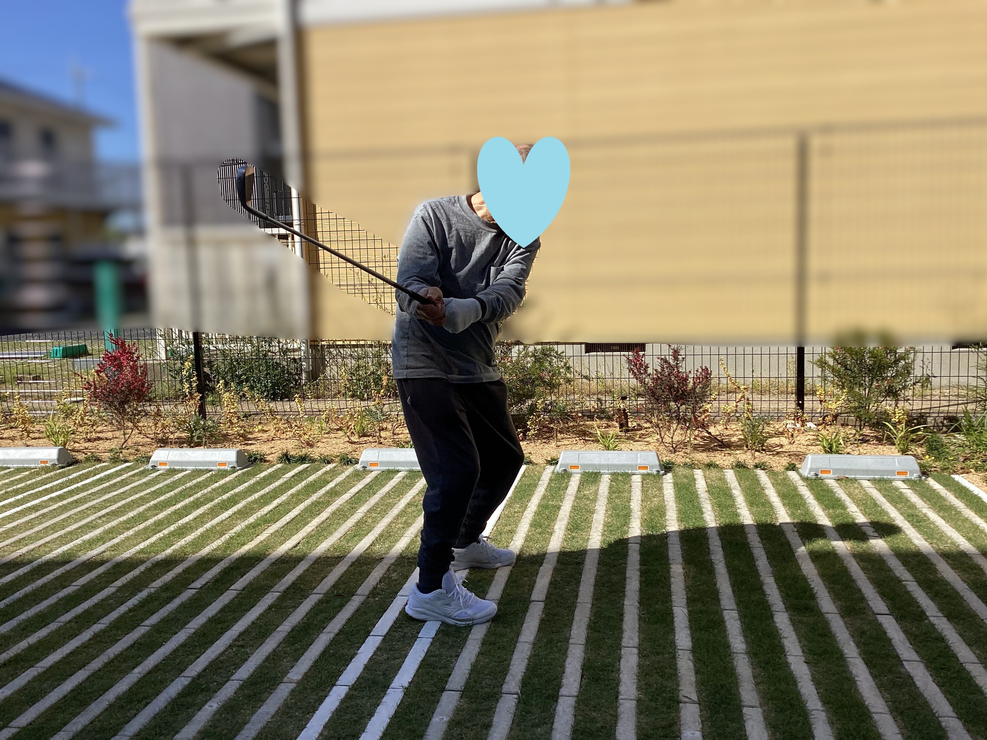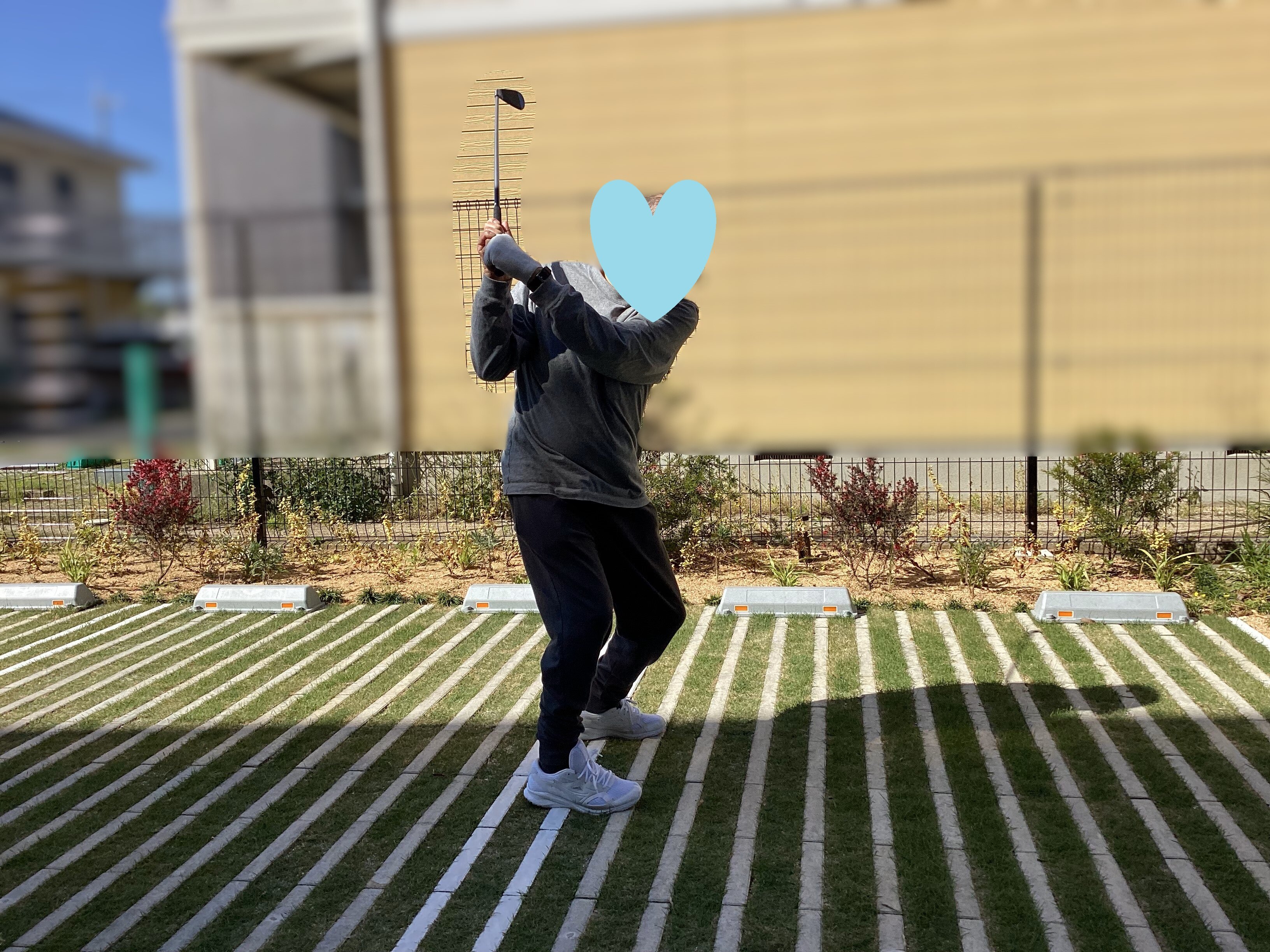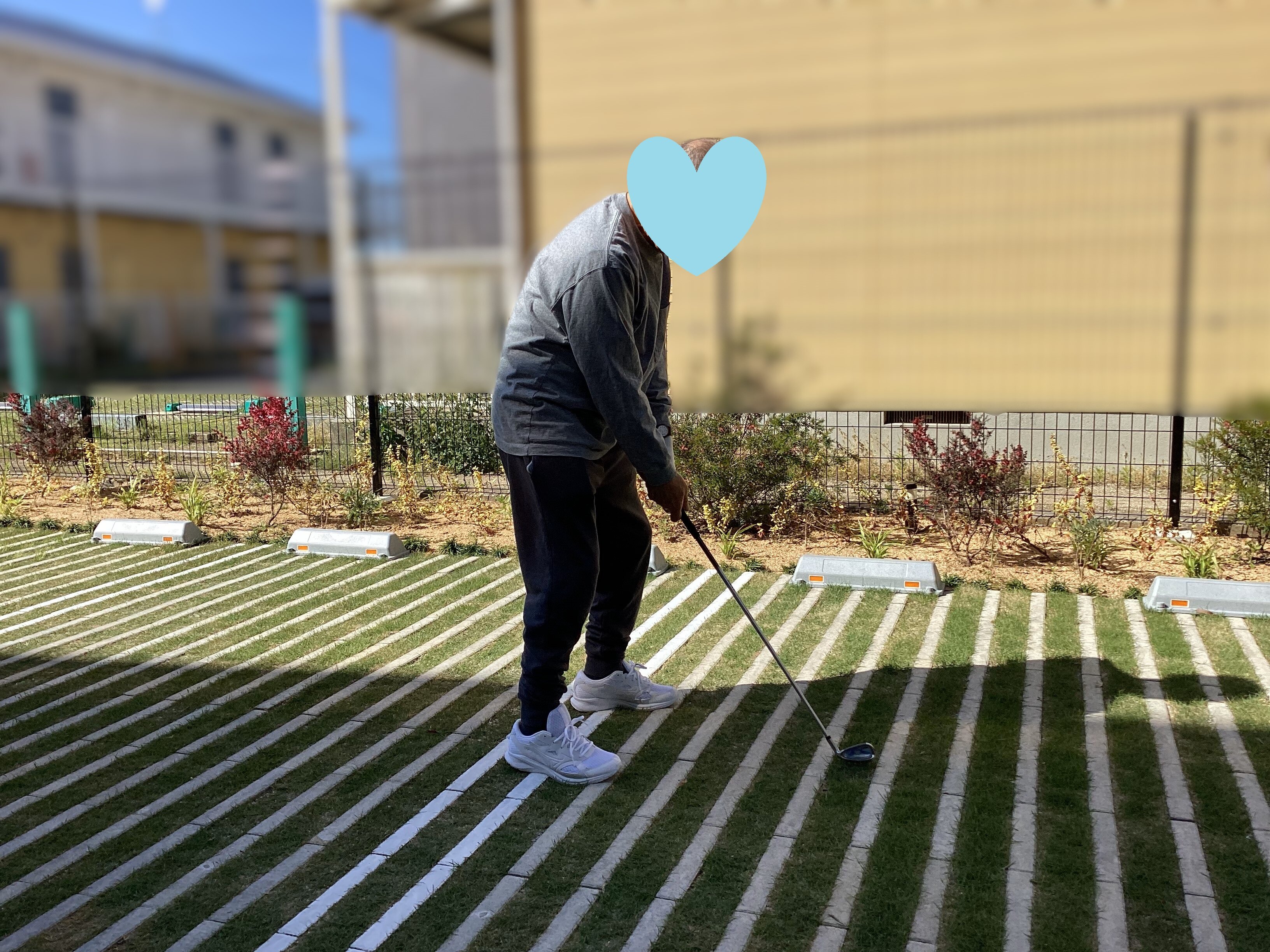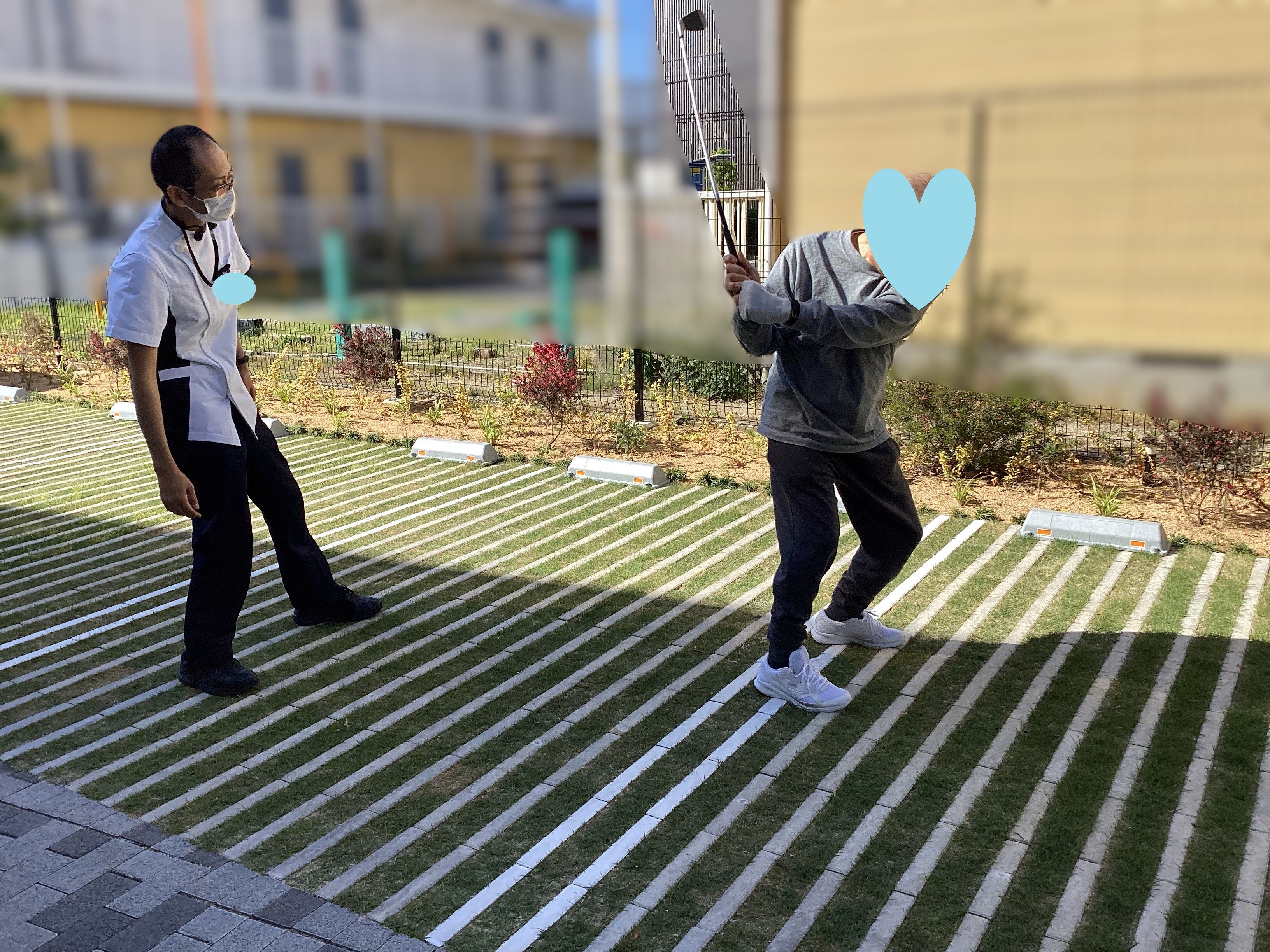 リハビリの一環として駐車場でゴルフの素振りを行いました!!