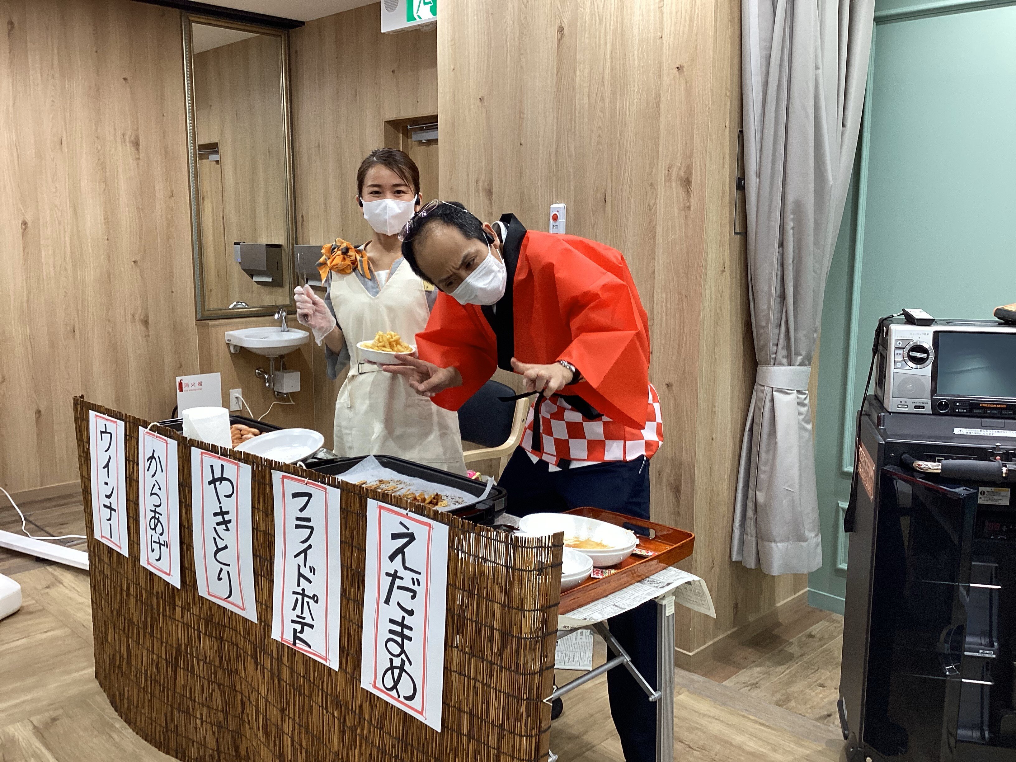 屋内ビアガーデンでしたが、屋外をイメージした緑のシート、『ビアガーデンのぼり』、職員は祭りのハッピを着て気分を盛り上げつつ、屋台風な飾りやドリンクバーもご用意!!
