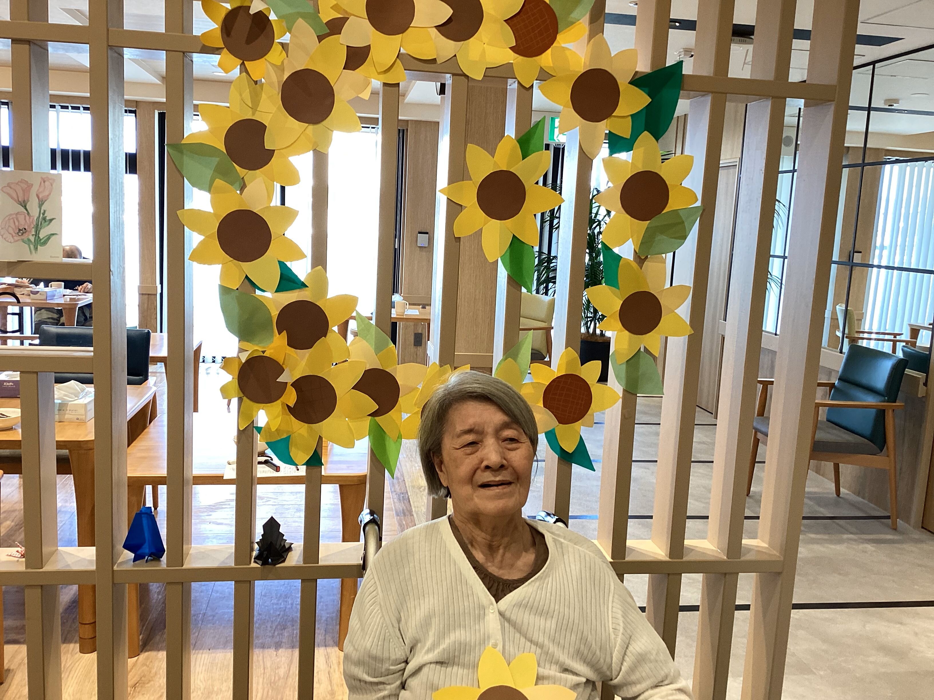 今回は先日ご入居者の皆さまと「ひまわり」を作って各階に飾り付けしたときの