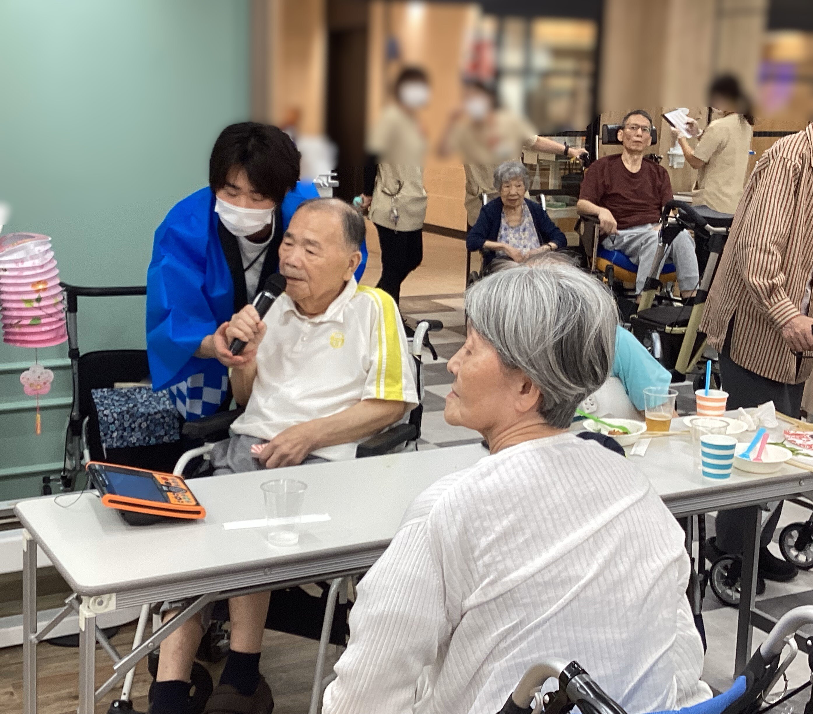 夏祭り感を出すのに、リハビリ室をのぼりやちょうちんで飾りつけしました。