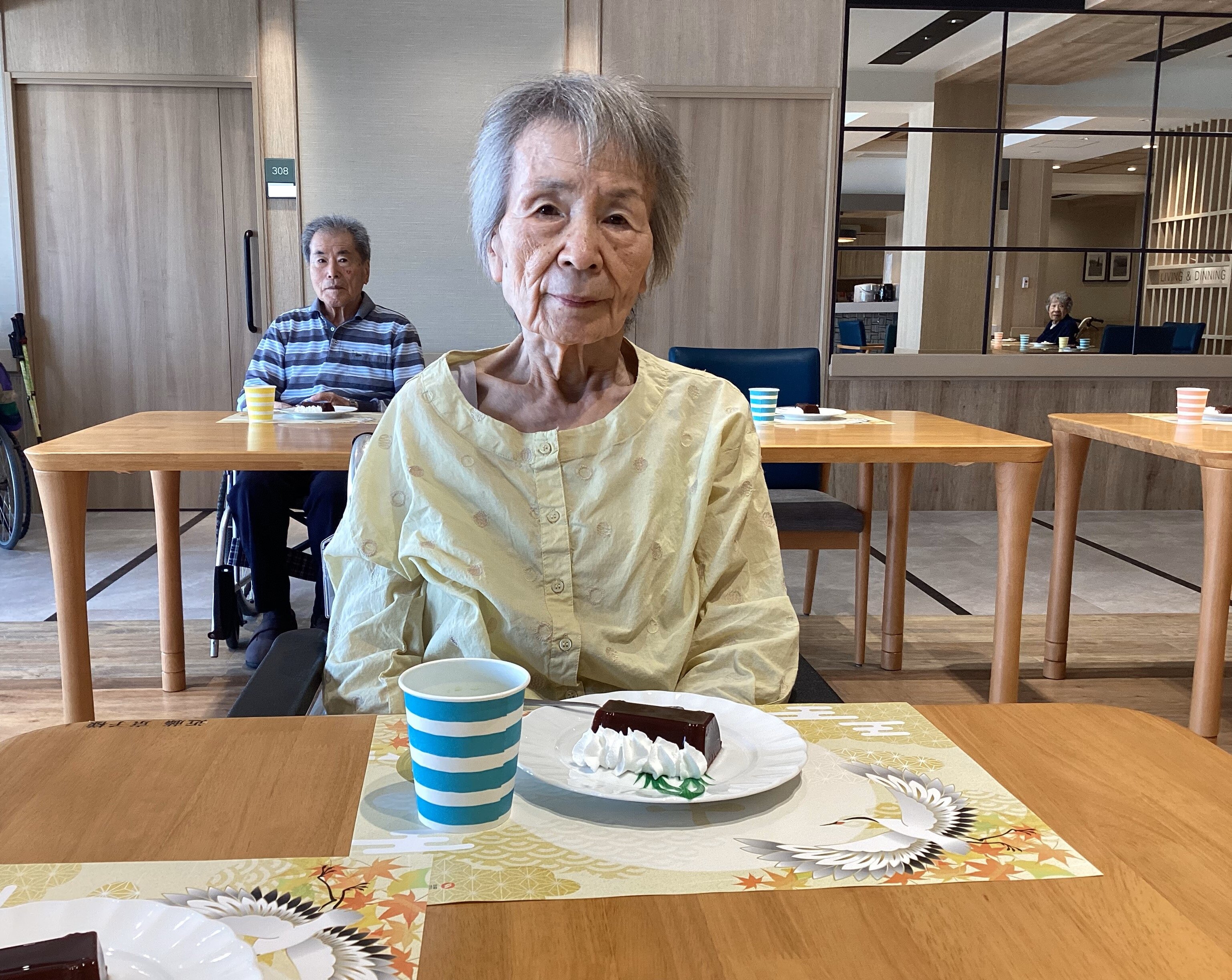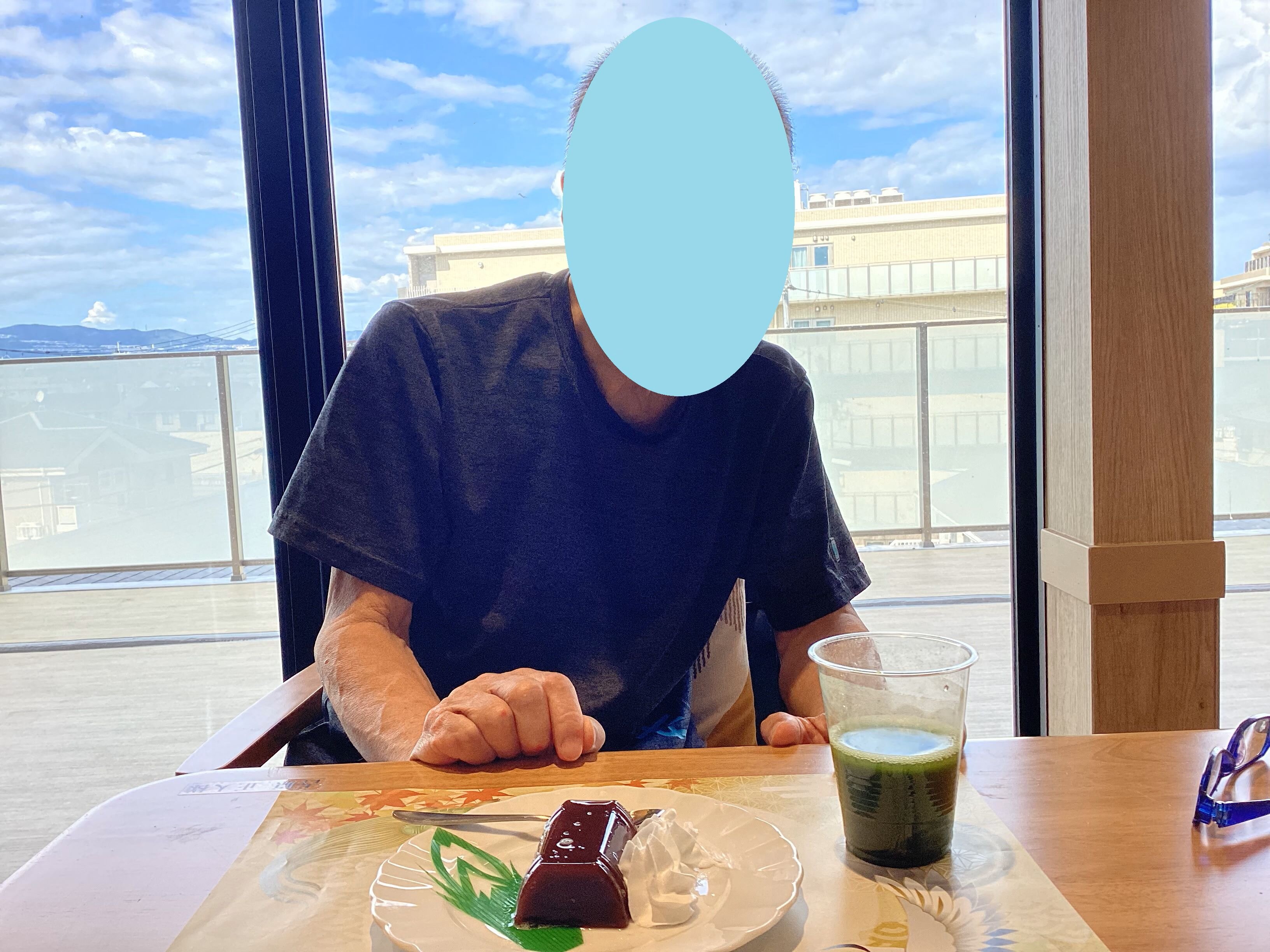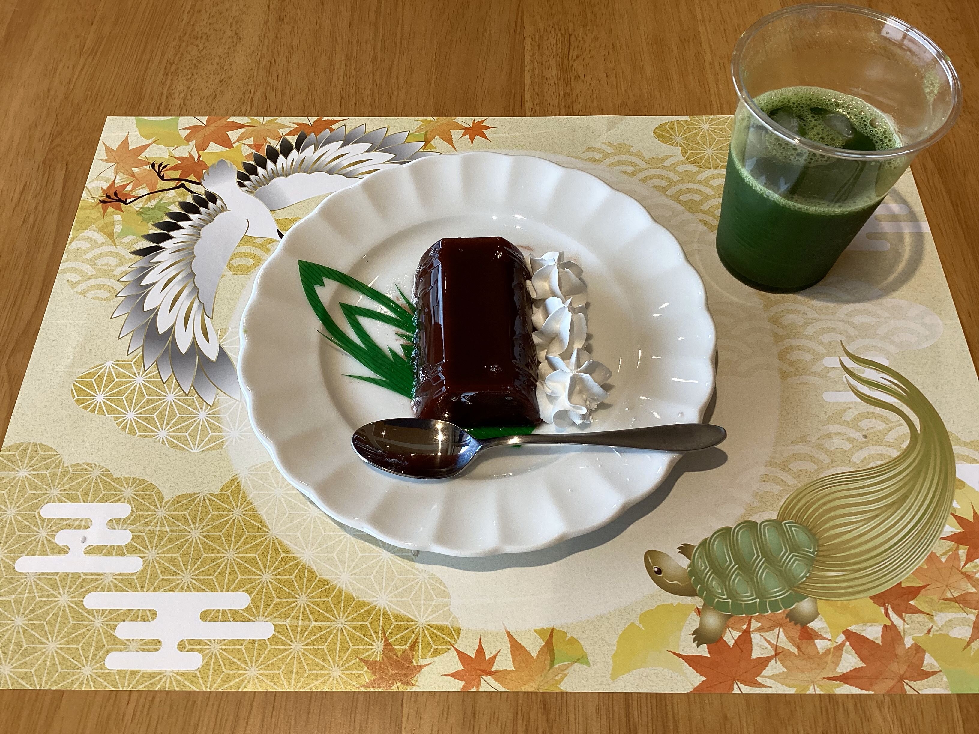 食後のおやつ、敬老の日カフェでは、水ようかんとお抹茶入りグリーンティーをご用意