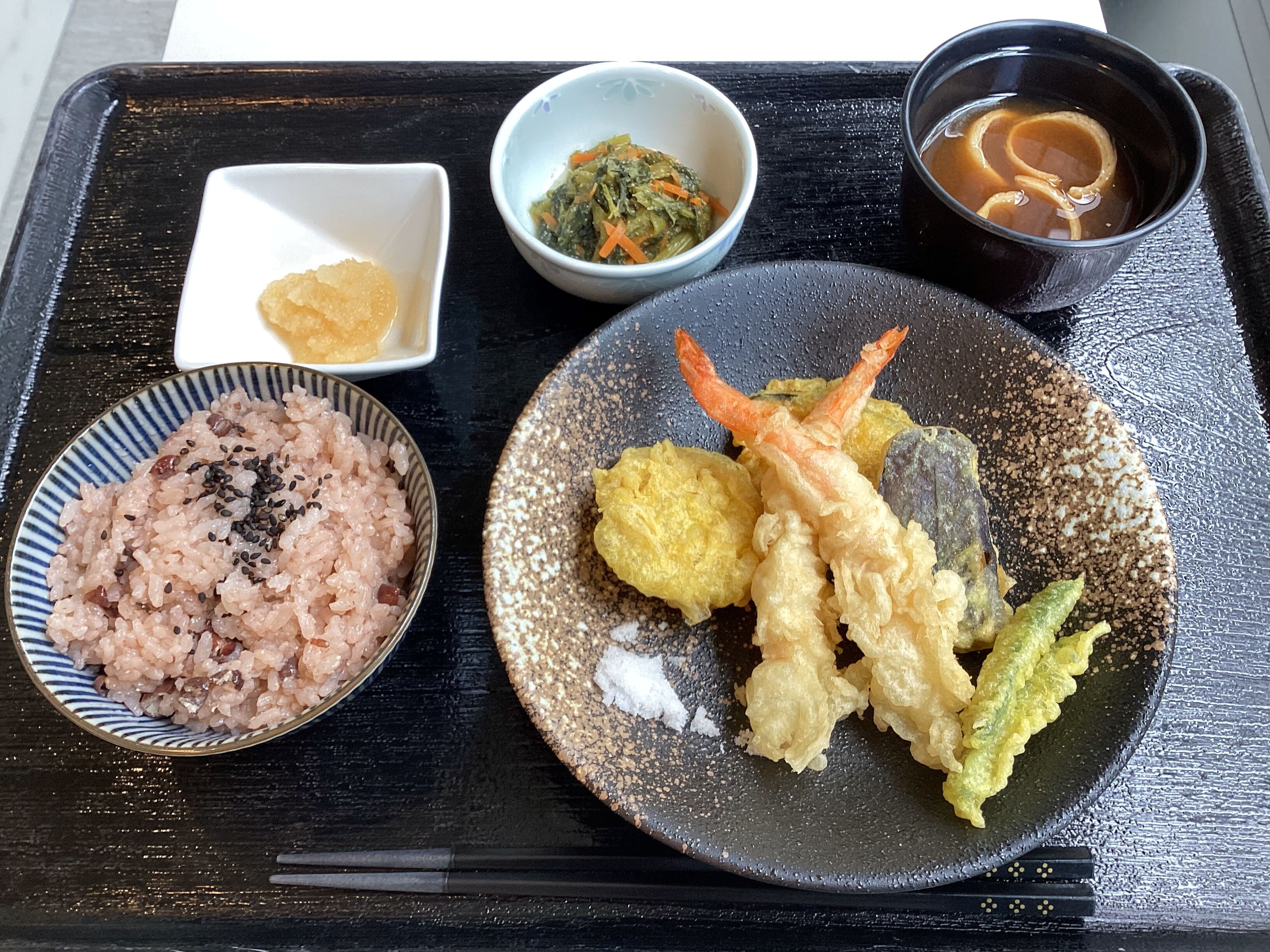 メニューは 赤飯・天ぷら・菊菜のごま酢和え・赤だし・料亭風でした♡(´~`)モグモグ