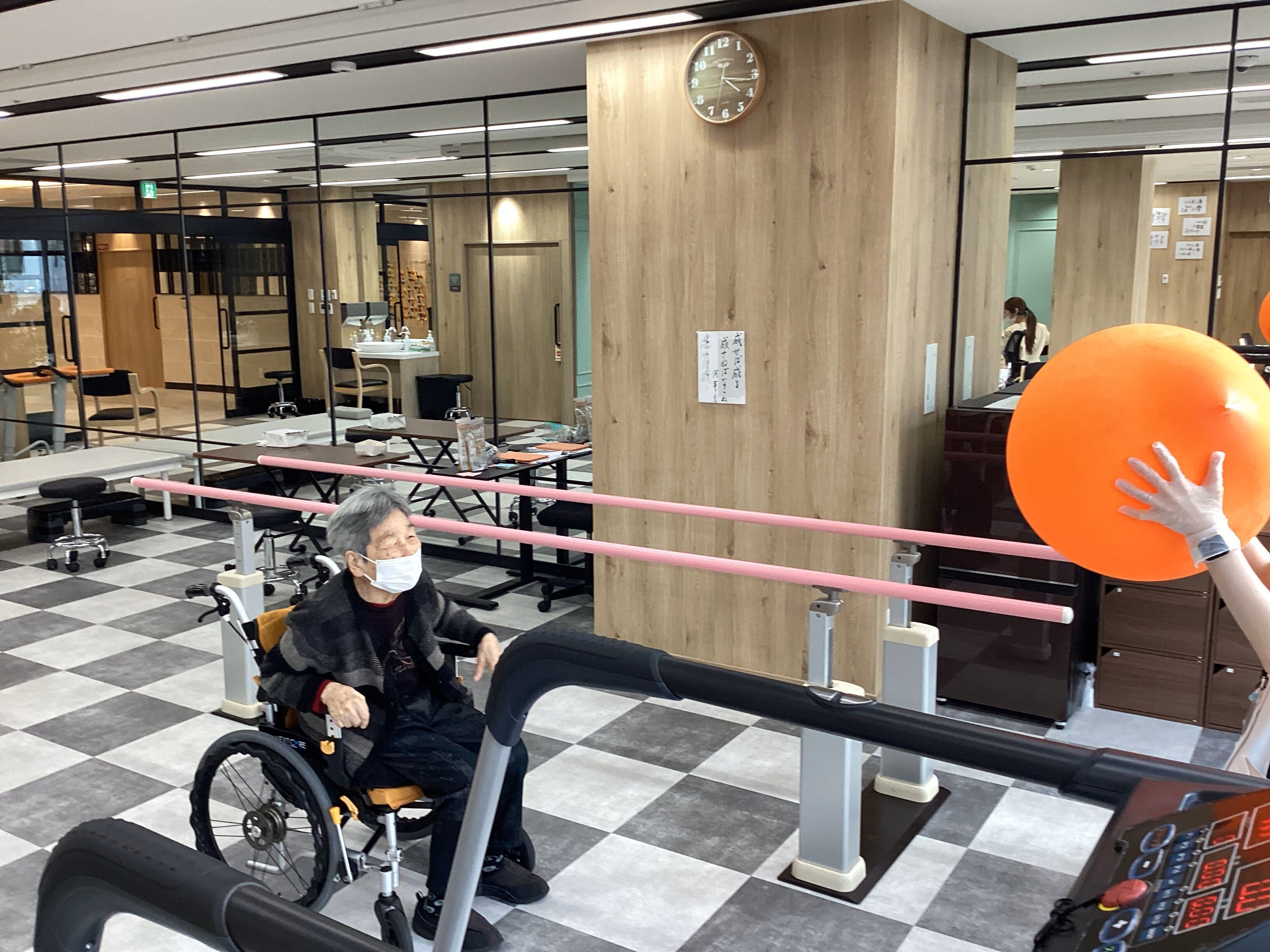 リハビリではマシーンやマッサージの他に、大きな風船を使ったトレーニングも人気です!!