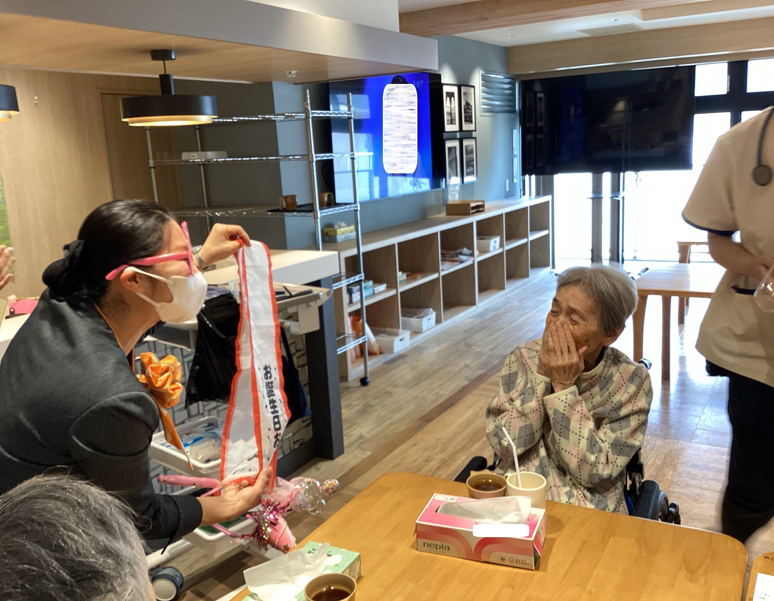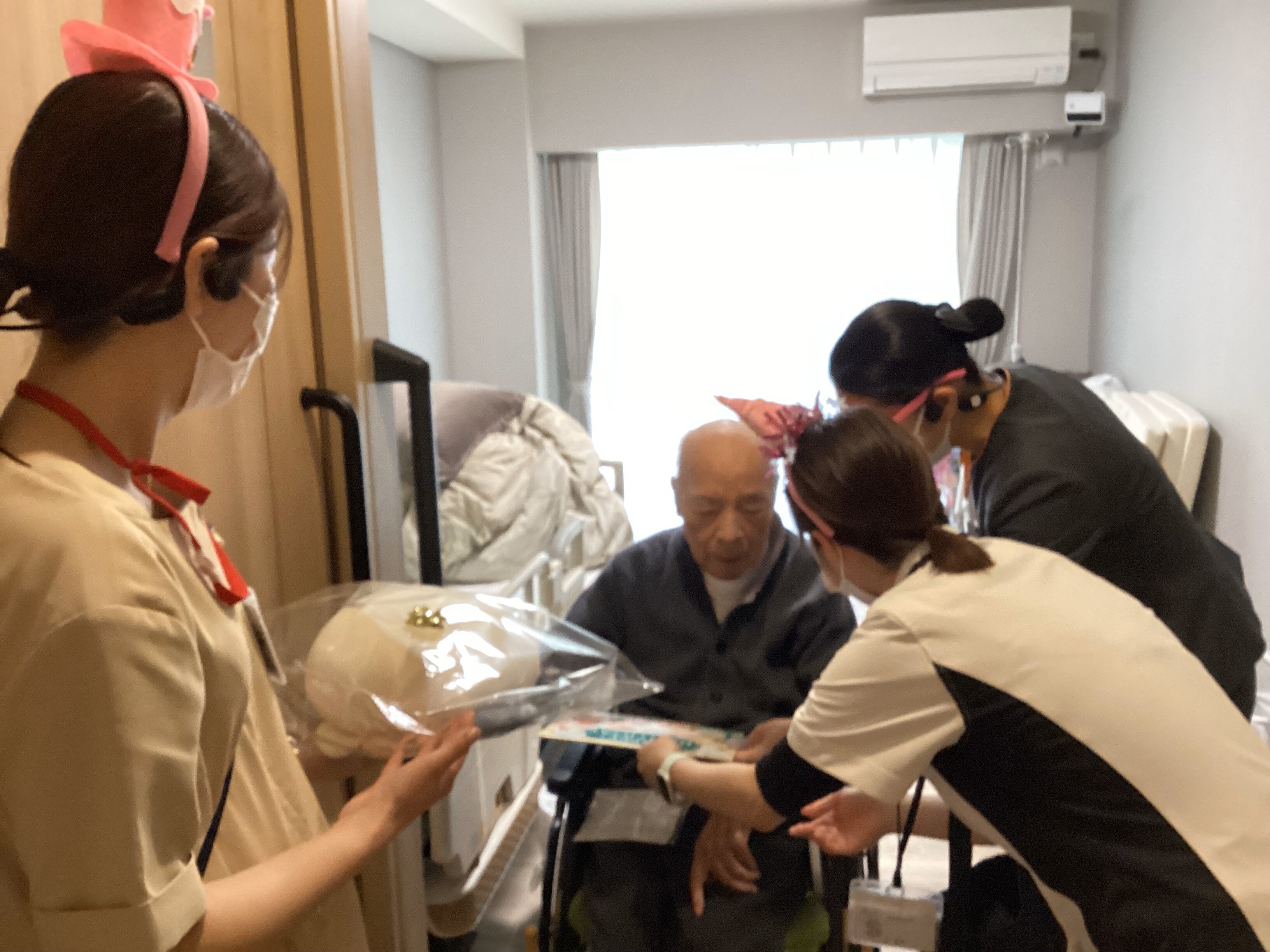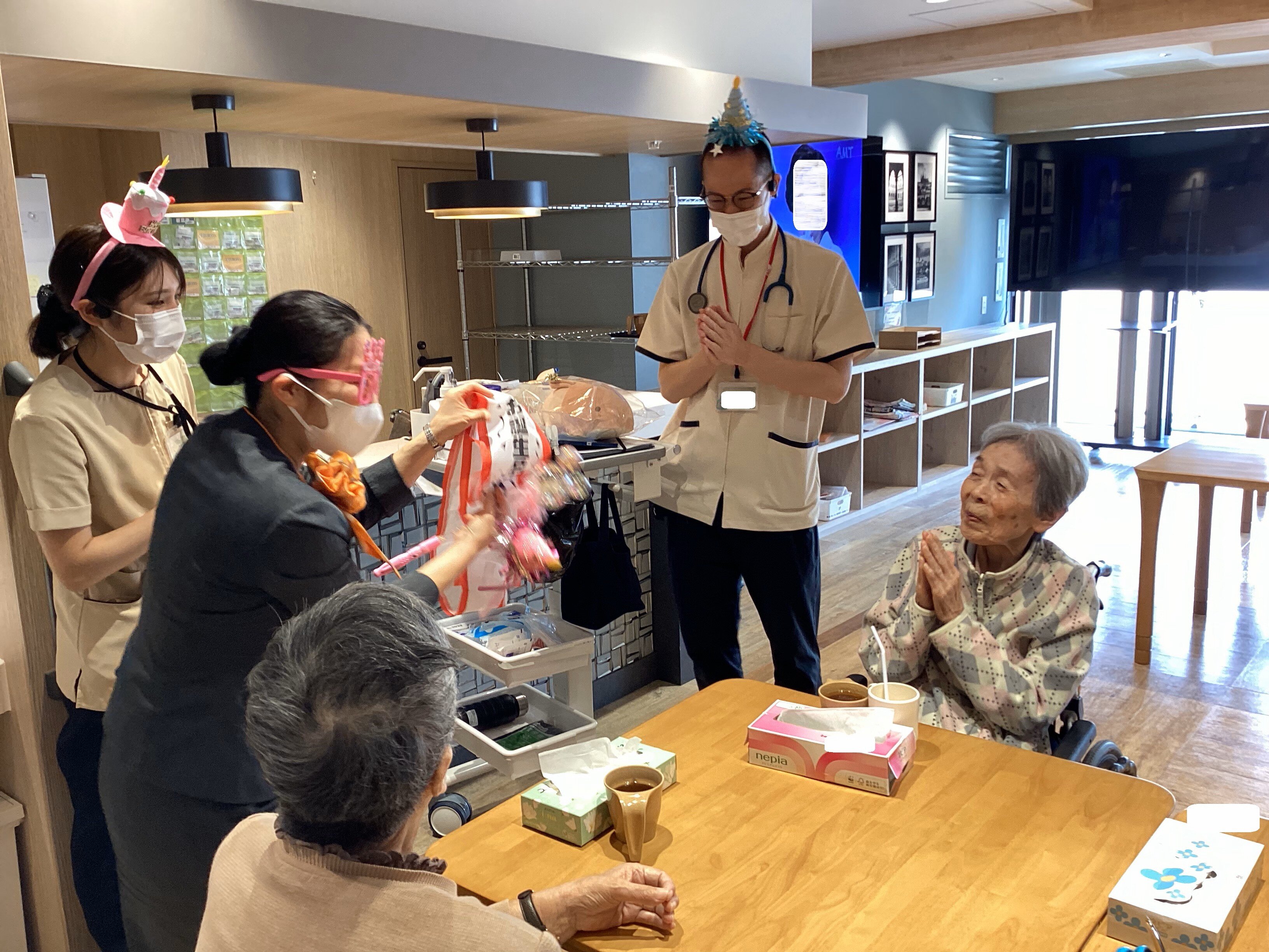 パーティグッズを身にまとった職員を見てはにかんでくださいました( *´艸`)