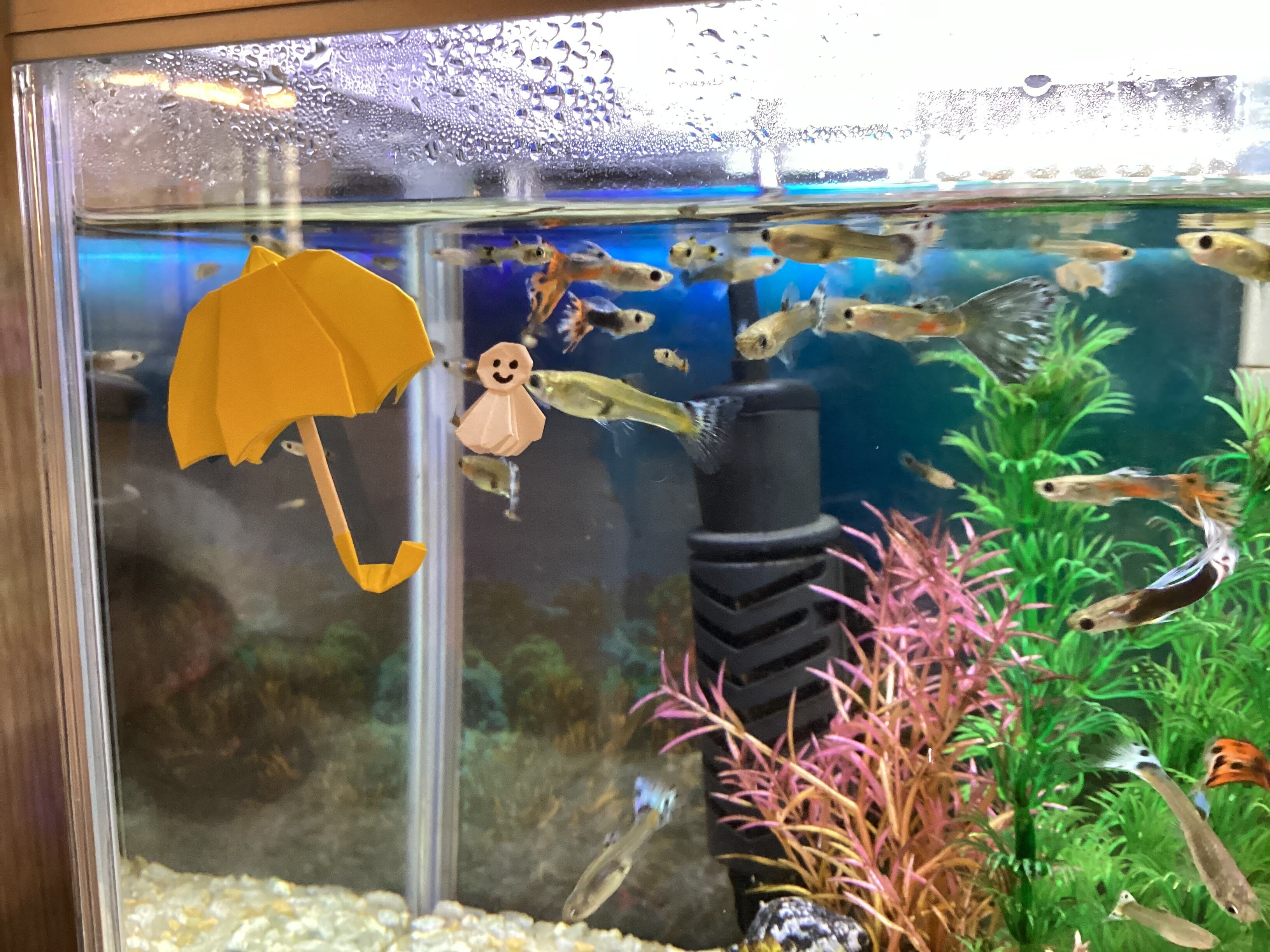 職員が手作りしました、6月のかわいらしい装飾が水槽に・・