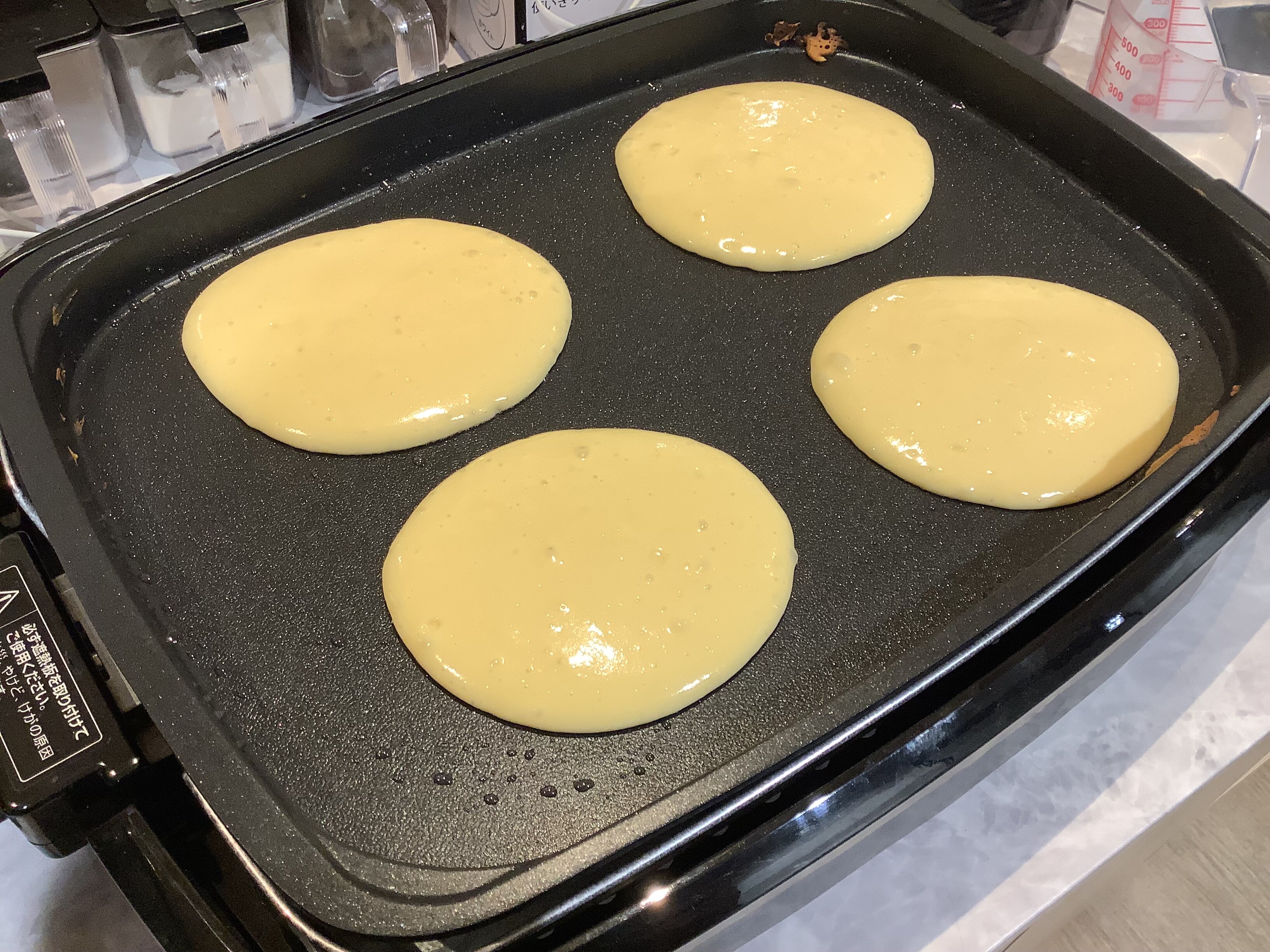 ホットケーキは粉と卵、牛乳を混ぜてホットプレートで焼く