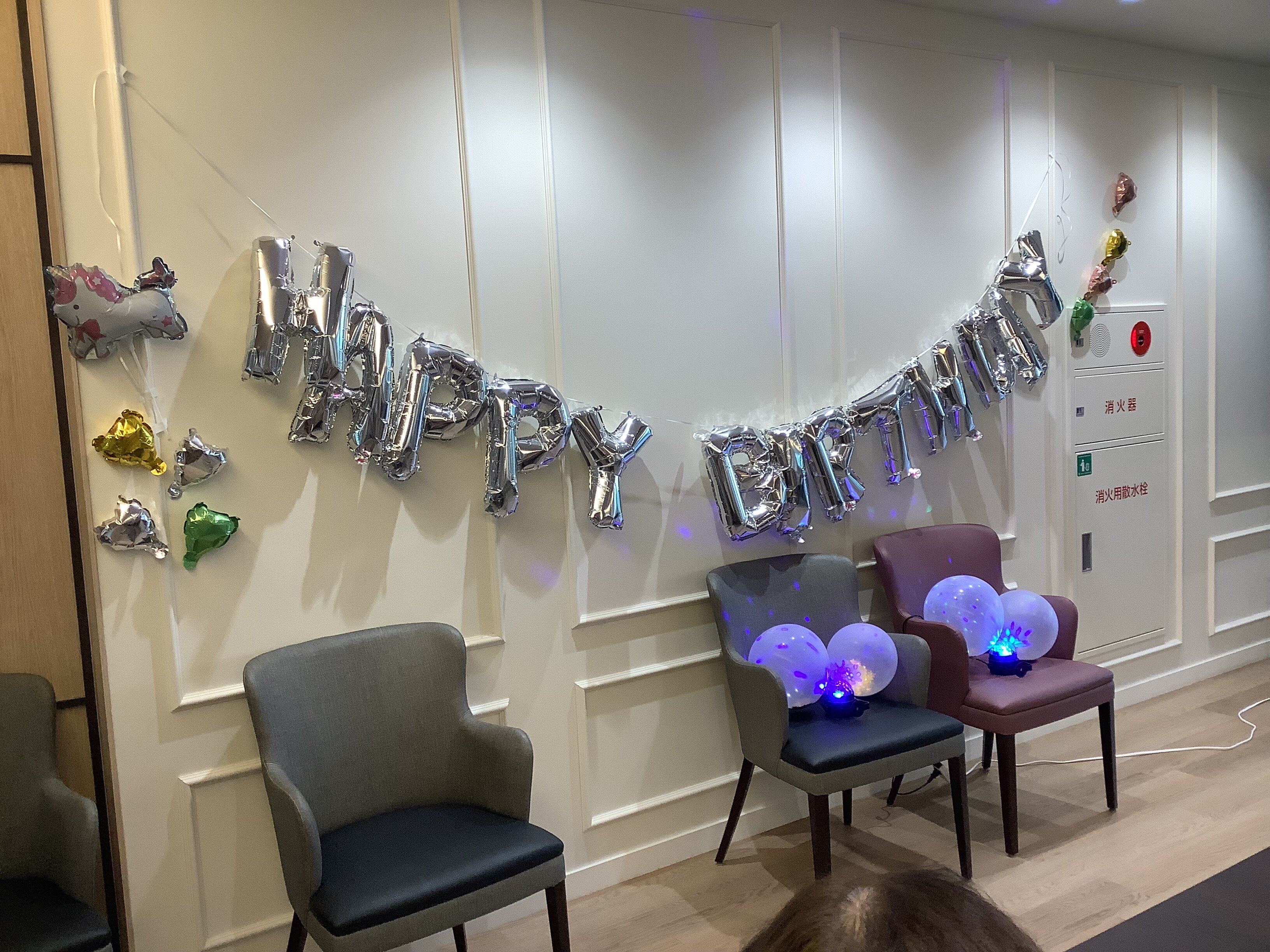 壁には誕生日のガーランド、ミラーボールに風船も活用してデコレーションしました^^☆