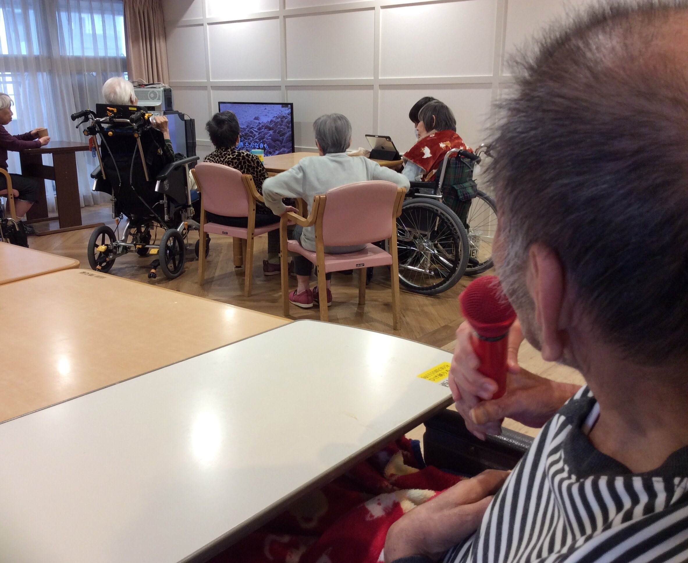 カラオケは人気のレクリエーションの一つであり、マイクを持って歌われる方がいれば、聞き役専門の方もいてお一人お一人が違った形で楽しまれております(≧▽≦)